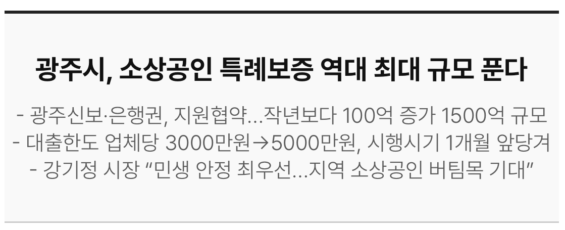 광주광역시는 경영 위기 소상공인과 자영업자의 자금난 해소를 위해 올해 소상공인 특례보증 사업으로 역대 최대 규모인 1500억원을 지원한다고 합니다.