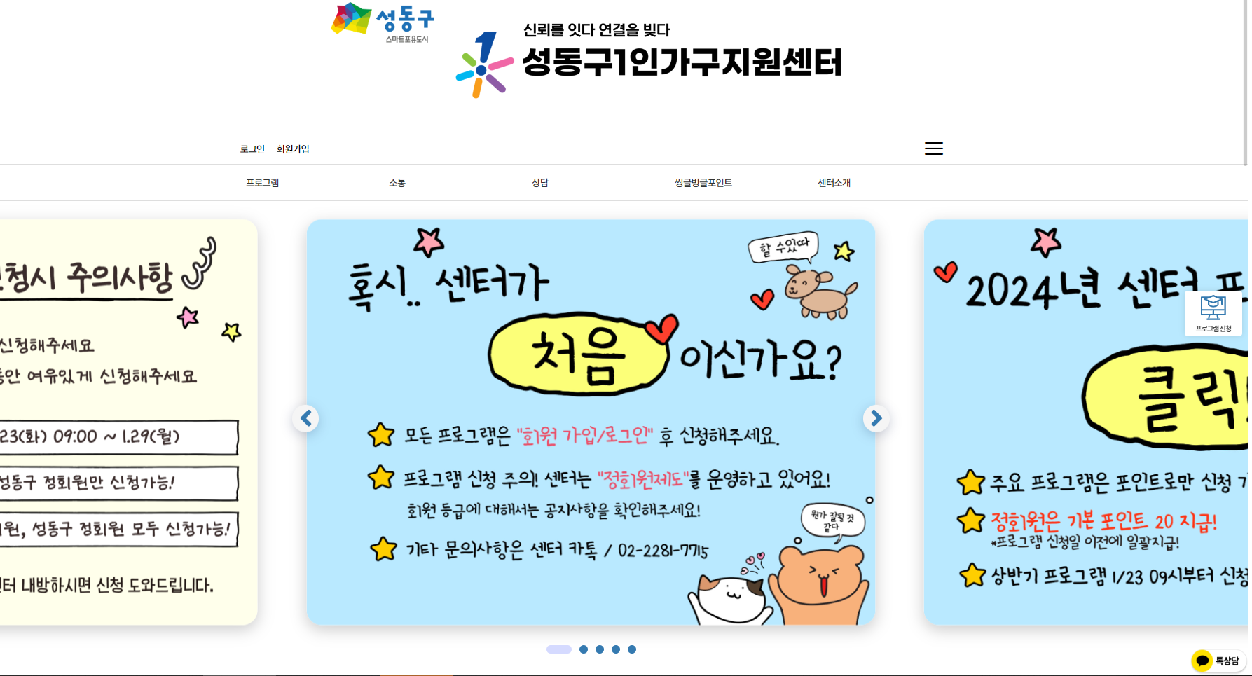 * 회원가입 및 프로그램 신청 등 상세 안내: 성동구1인가구지원센터센터 누리집(https://sd1in.net/)