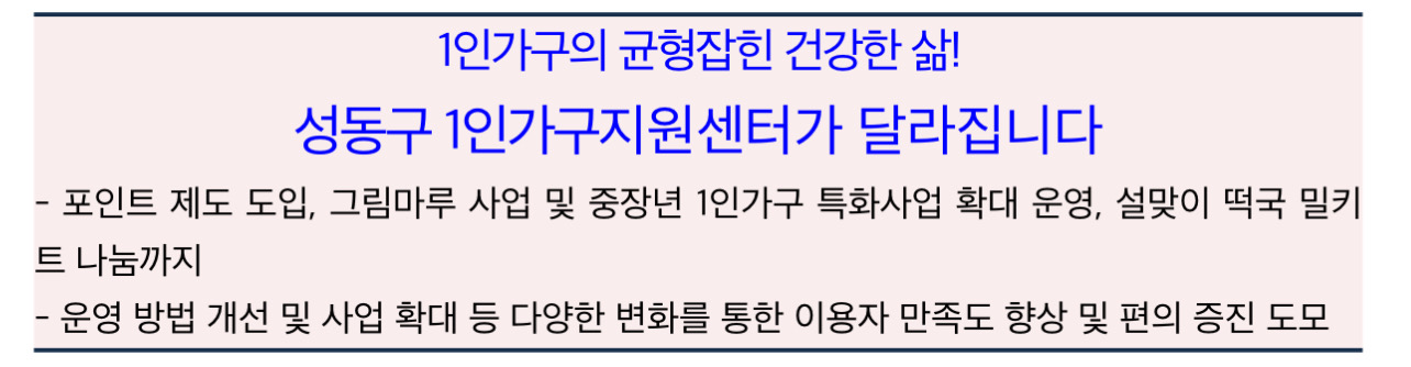 서울 성동구(구청장 정원오)가 올해 성동구 1인가구지원센터의 운영 방법 개선 및 사업 확대 등을 통해 이용자 만족도 향상 및 편의 증진을 도모한다고 밝혔습니다.