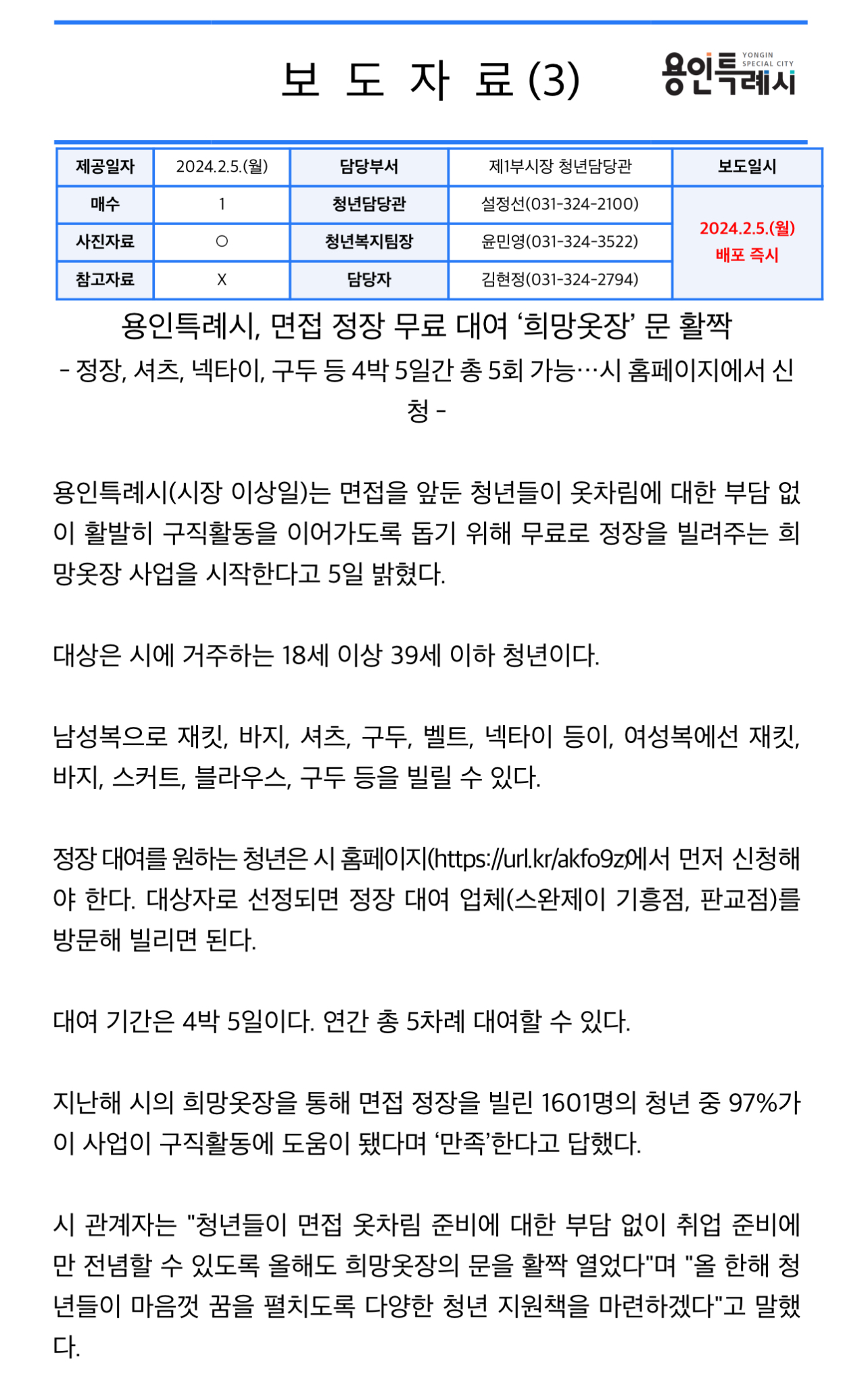 지난해 용인시의 희망옷장을 통해 면접 정장을 빌린 1601명의 청년 중 97%가 이 사업이 구직활동에 도움이 됐다며 ‘만족’한다고 답했습니다.