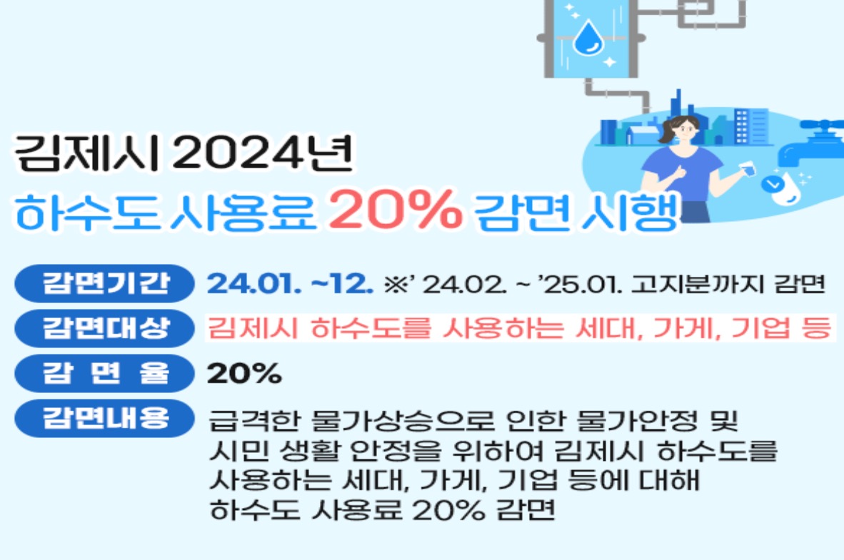 김제시는 물가 안정 및 시민들의 부담 감소를 위해 2024년 하수도 사용료를 20% 감면한다고 합니다.