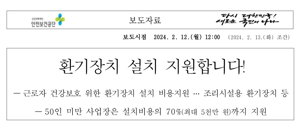 안전보건공단(이사장 안종주, 이하 공단)은 화학물질 등에 의한 급성 중독 등으로부터 근로자 건강을 보호하기 위한 환기장치 설치비용 지원사업을 2024년 올해에도 지속 추진한다고 합니다.