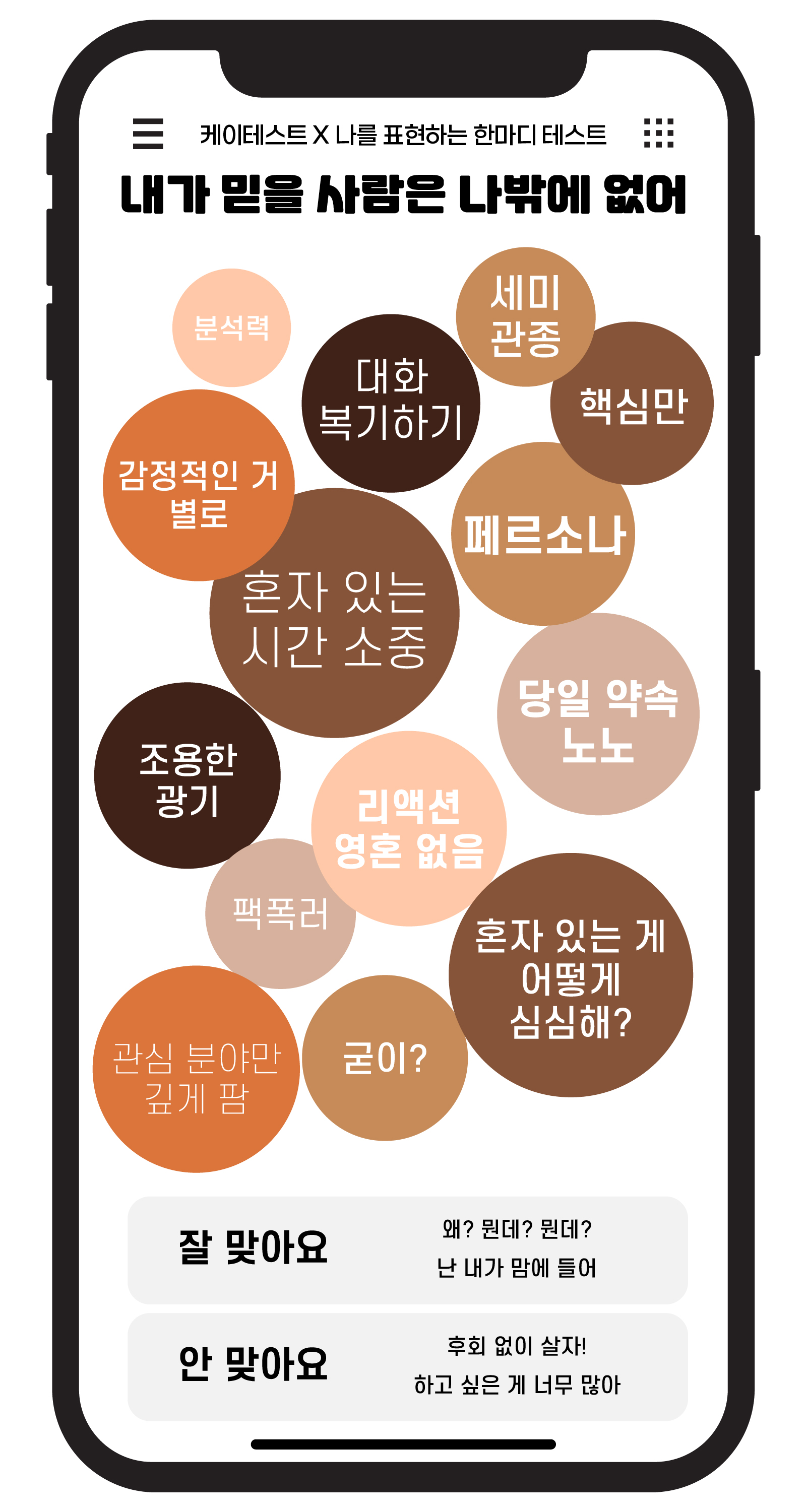 케이테스트라는 사이트에서 나를 한마디로 표현한다면 어떨지 테스트로 알려주는 ‘나를 표현하는 한마디 테스트’를 소개드리겠습니다.