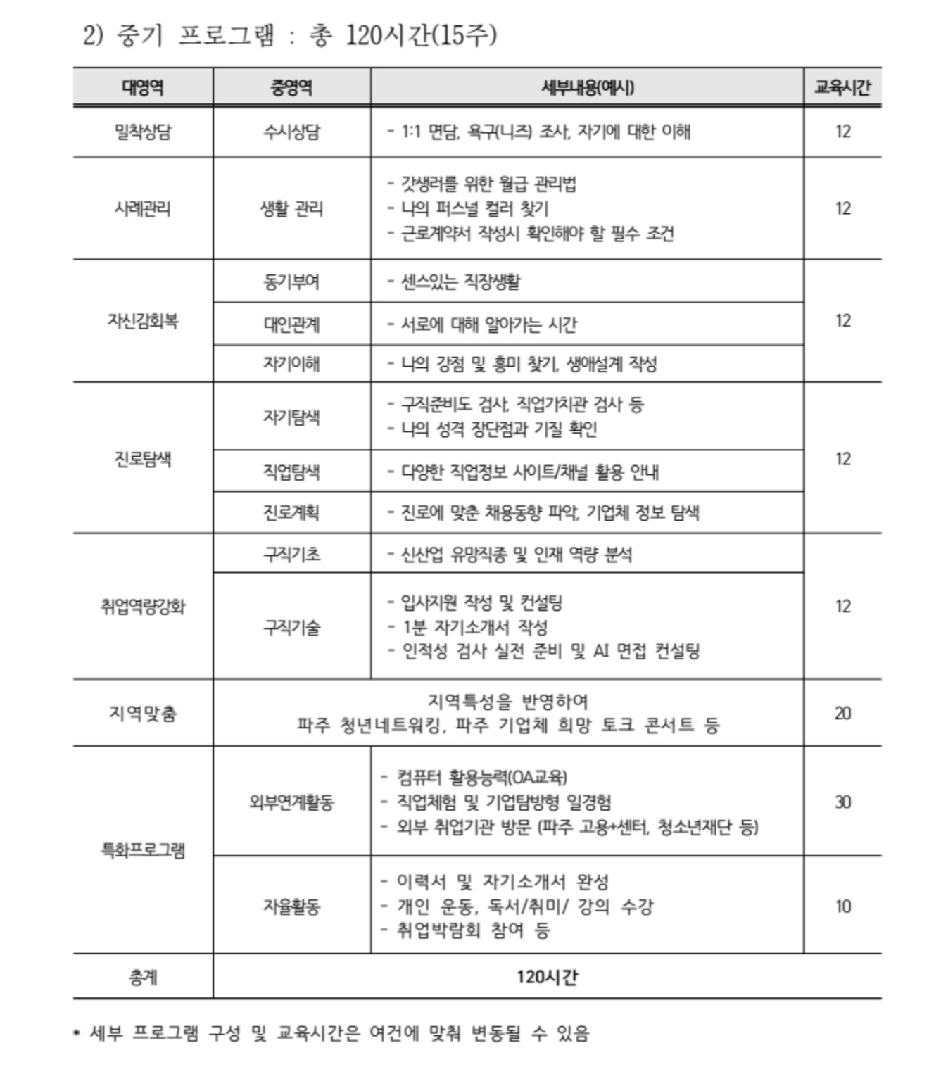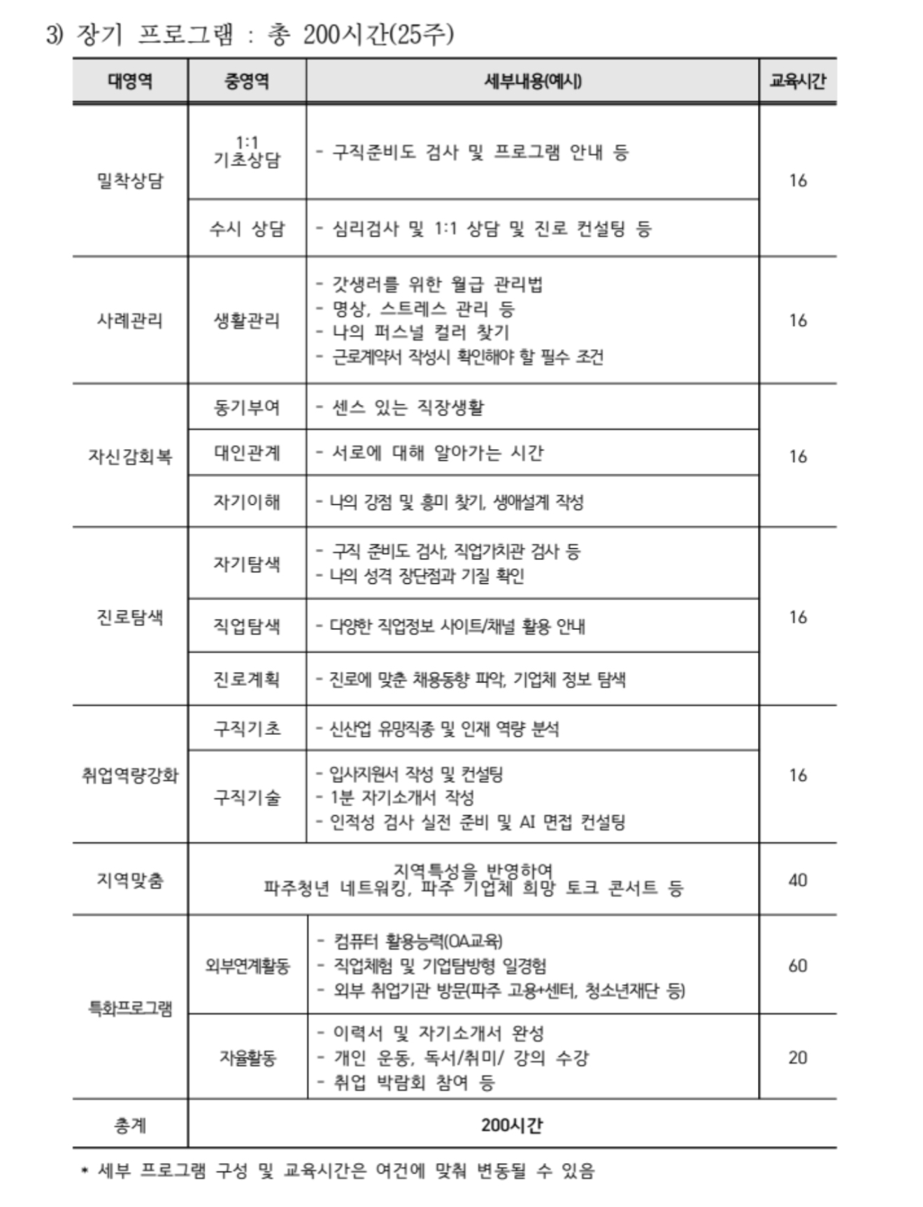 프로그램은 단기(5주), 중기(15주), 장기(25주) 과정으로 운영되, 1대 1 상담, 면접상담, 지역 연계, 자율활동 등의 내용으로 구성돼 있습니다.