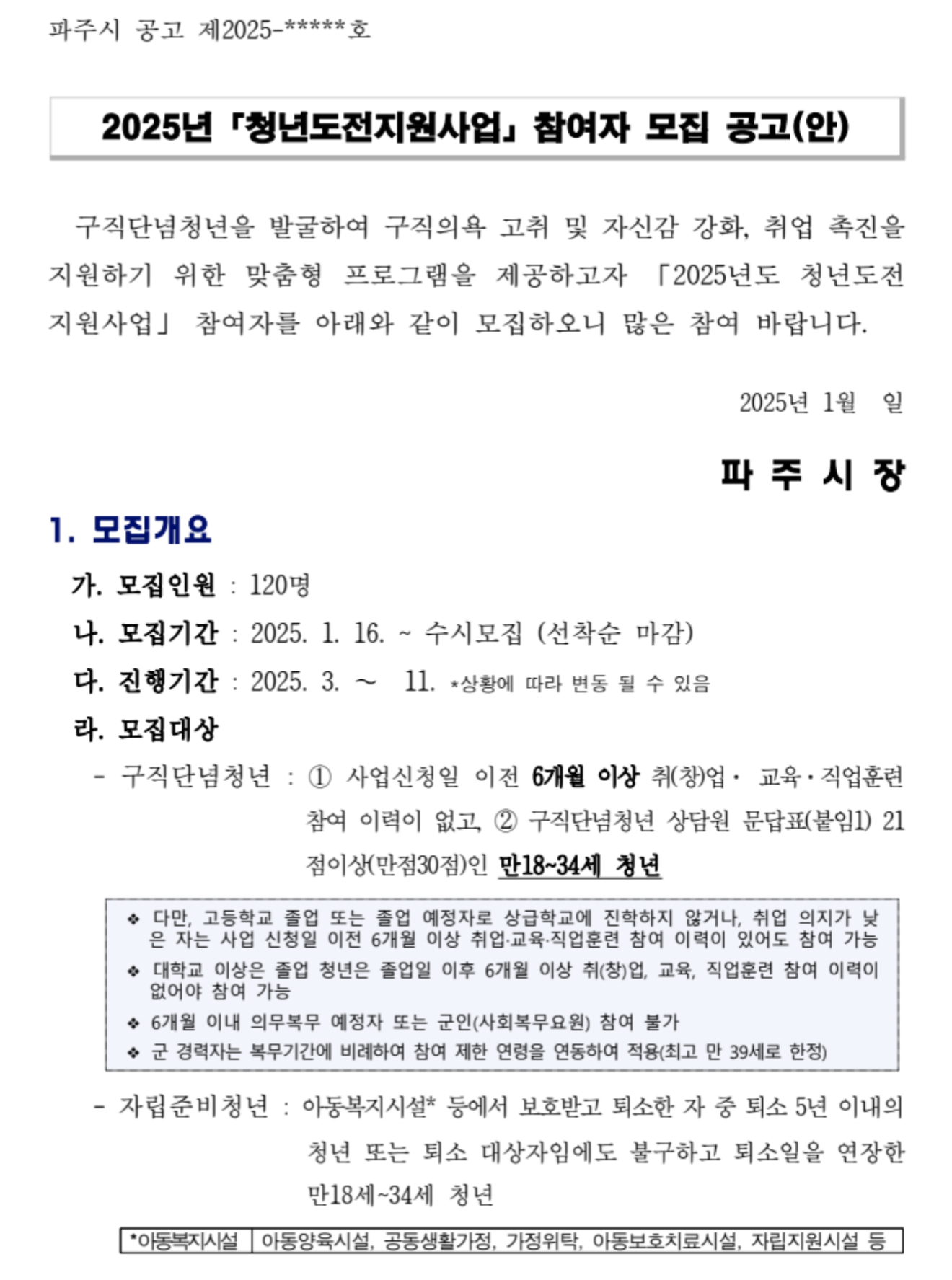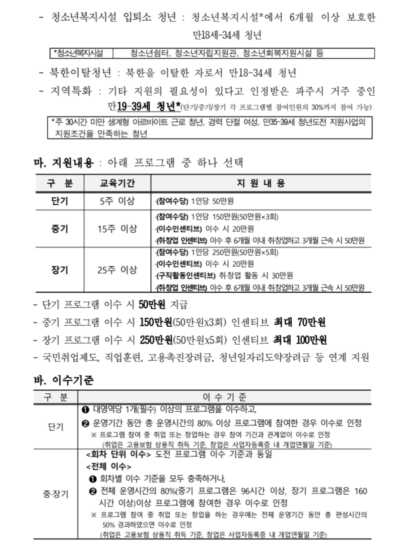 파주시 청년도전 지원사업 참여 대상은 ▲18~34세 구직단념청년 ▲자립준비청년 ▲청소년복지시설 입퇴소 청년 ▲북한 이탈 청년 ▲지역특화청년(19~39세) 등입니다.
