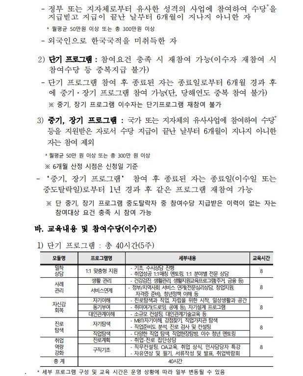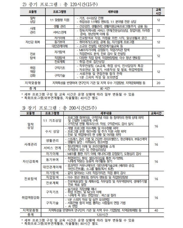 대전 청년도전 지원사업 프로그램은 단기(5주), 중기(15주), 장기(25주) 과정이며 자신감 회복과 진로 탐색, 취업역량 강화를 위한 다양한 내용으로 구성됐습니다.