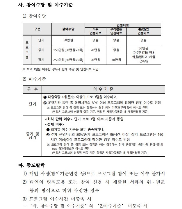 단기 과정 참여자에게는 50만 원의 수당이 지급되며, 중장기 과정 참여자는 참여 수당 외에 이수, 구직활동, 취업·창업에 대한 인센티브로 최대 350만 원까지 지원받을 수 있습니다.