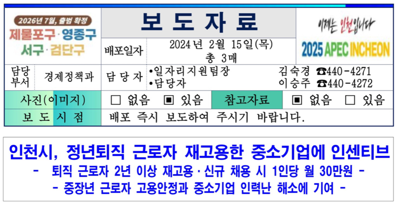 인천광역시는 정년퇴직 근로자를 재고용하거나 신규 채용하는 중소기업에 1인당 월 30만 원의 인센티브를 지원한다고 밝혔습니다.