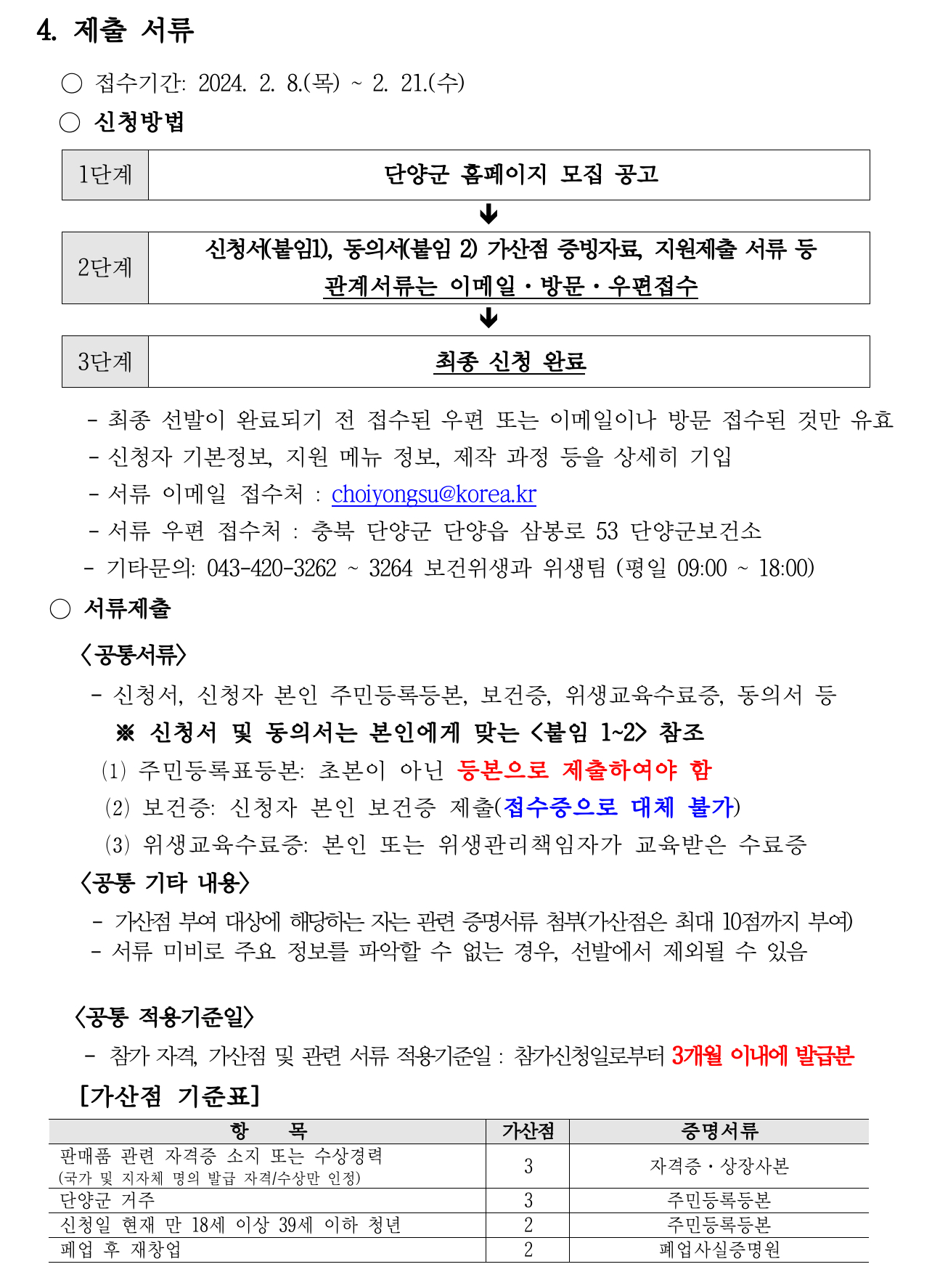 - 우편 또는 방문접수처: 단양읍 삼봉로 53 단양군보건소 2층 위생팀