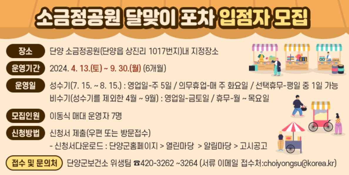 충북 단양군에서는 단양군민과 관광객에게 새로운 먹거리, 볼거리 등 다양한 즐길거리를 제공하여 단양의 야간 명소를 발굴하고자 소금정공원 달맞이 포차에서 꿈과 열정을 펼칠 입점자를 모집하오니 많은 관심과 참여 바란다고 밝혔습니다.