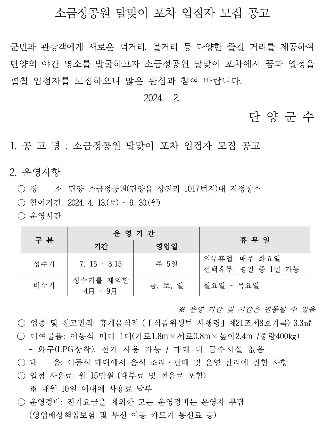 - 장소: 단양 소금정공원 내 지정장소