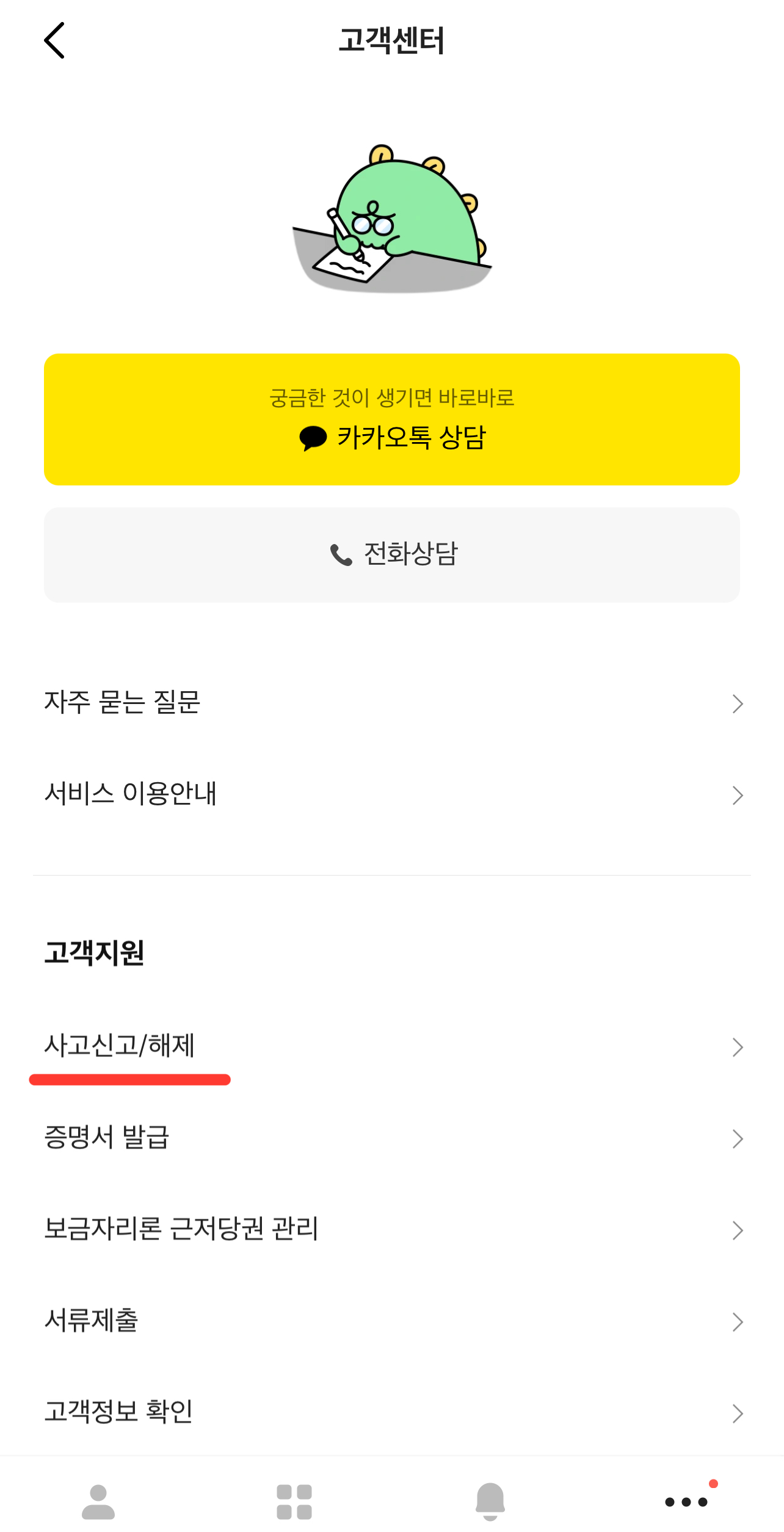 2. 하단에 ...메뉴 클릭 후 고객센터 탭 클릭
