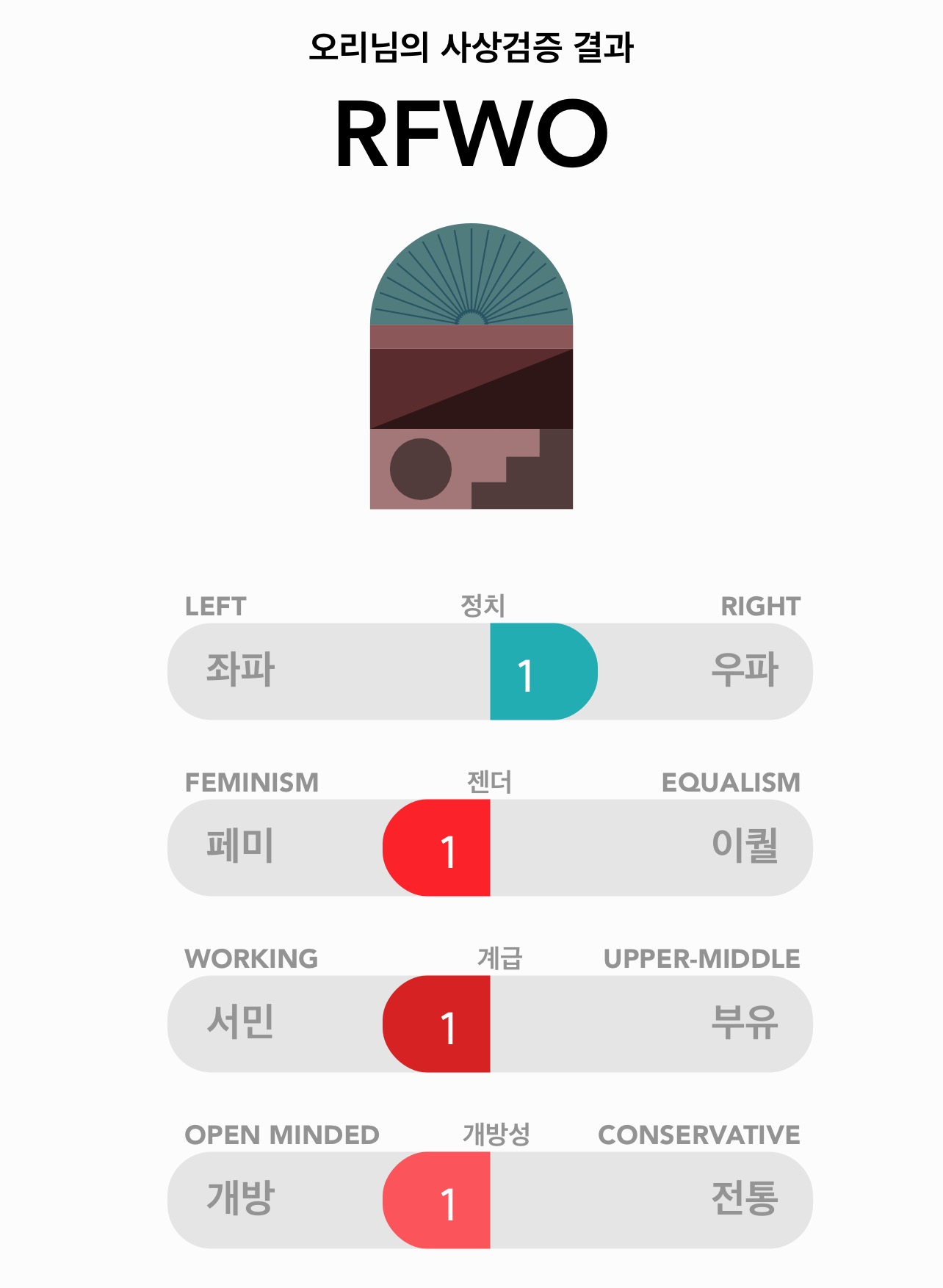 ※ 본 테스트는 웨이브 오리지널 [사상검증구역: 더 커뮤니티]의 프로그램 내에서 활용하기 위해 제작된 척도로, 측정값이 응답자의 정치사회적 견해와 일부 일치하지 않을 수 있습니다.