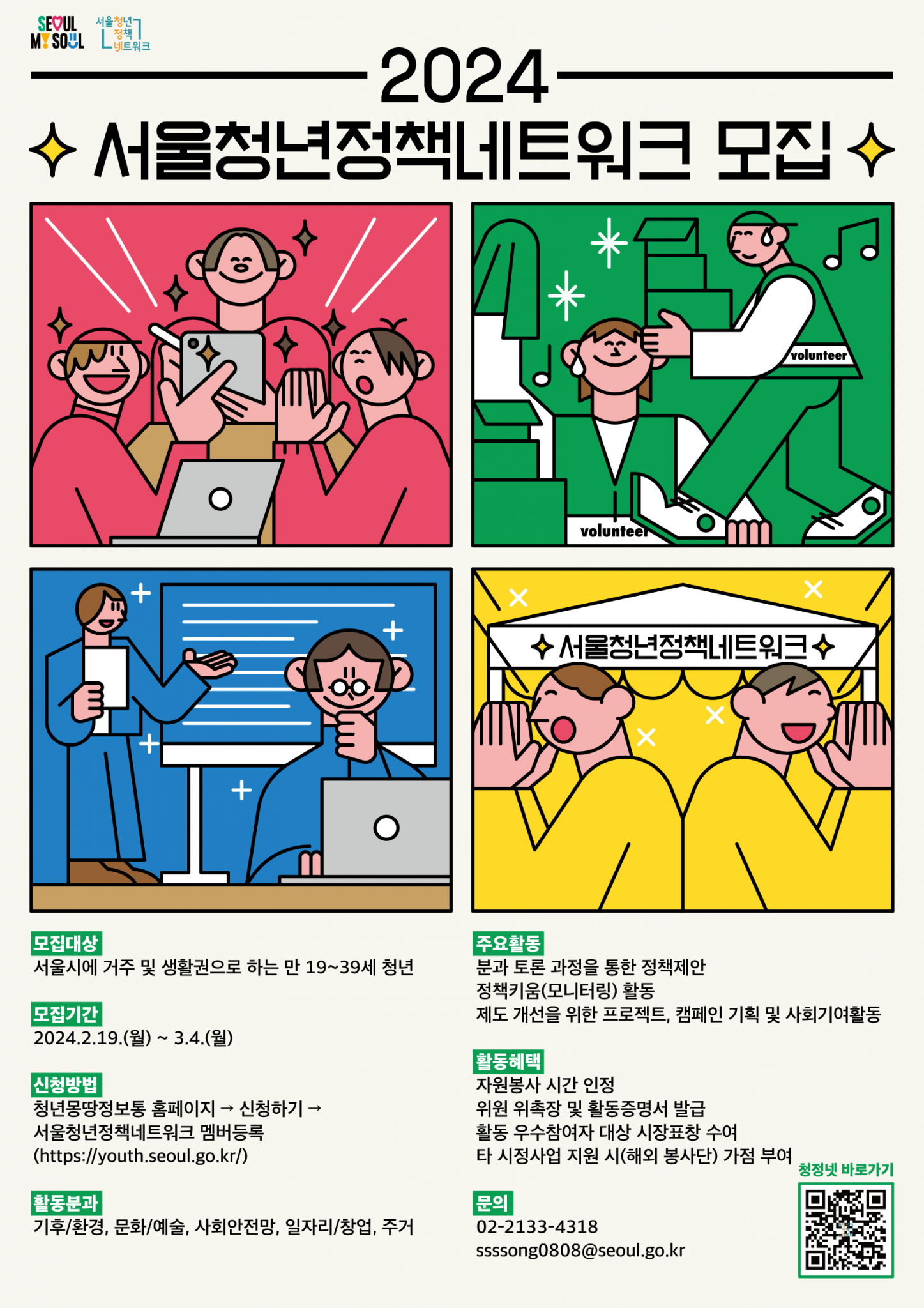 2024년 올해로 운영 10년차를 맞이한 서울시 청년참여기구 ‘서울청년정책네트워크(이하 ‘서울청정넷’)’에서 청년의 목소리와 현실을 반영한 체감도 높은 정책을 함께 만들어 갈 서울 청년 500명을 모집한다고 밝혔습니다.