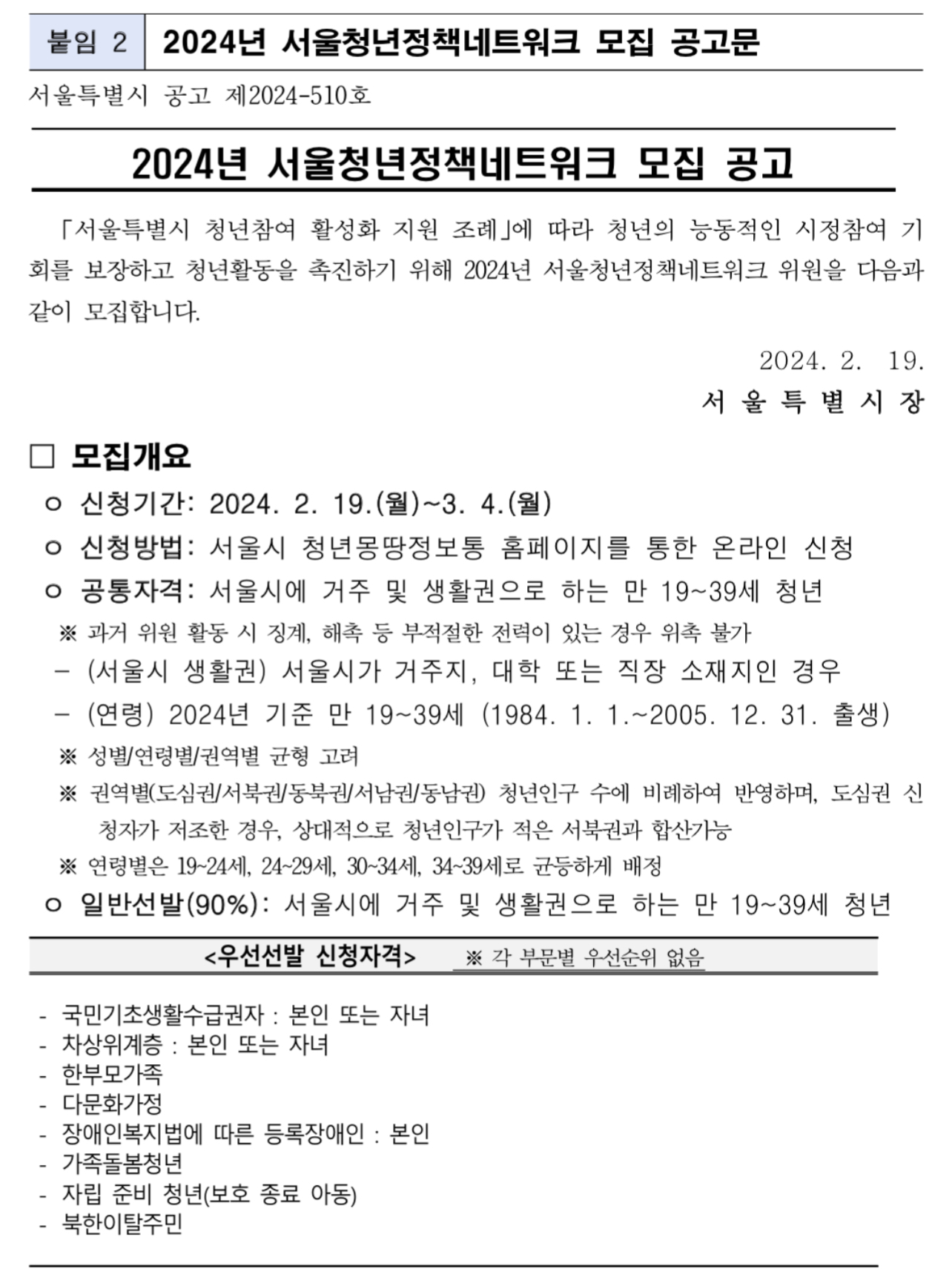<서울 거주·서울 생활권 만 19~39세 청년 대상 2024년 2월 19일(월)부터 모집 시작>