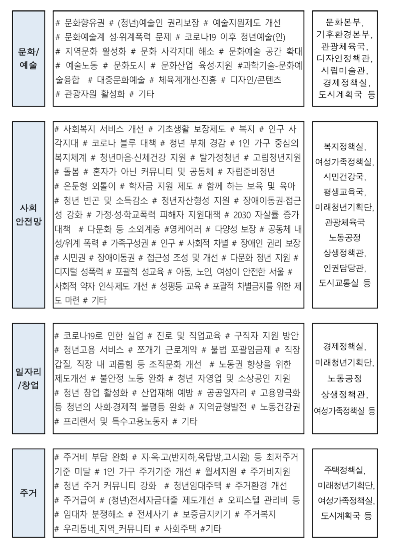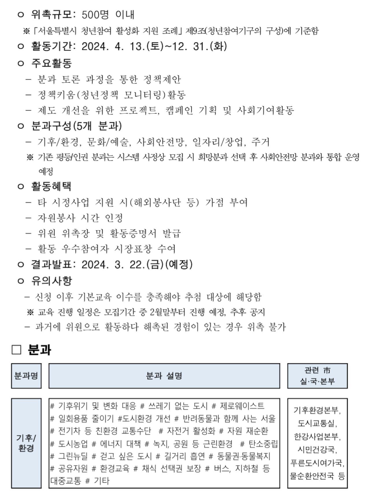 이렇게 선발된 청년들은 서울청정넷 위원으로 위촉돼, ① 기후·환경 ② 문화·예술 ③ 사회안전망 ④ 일자리·창업 ⑤ 주거 등 5개 분과 중 하나를 선택해 활동하게 된다고 합니다