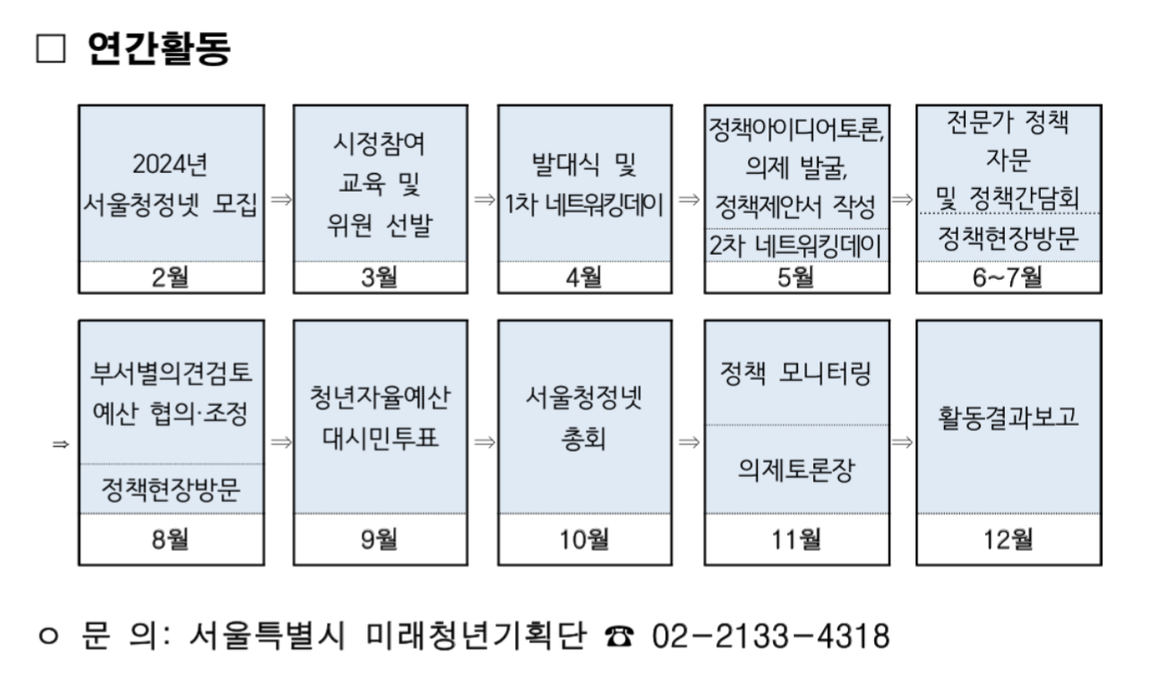 2024년 올해부터는 서울청정넷의 효율적인 구성과 운영을 위해 신청 및 선발방식을 개선해 서울시정에 관심이 많고 의지가 있는 청년들이 더 많이 참여할 수 있도록 유도한다고 합니다.