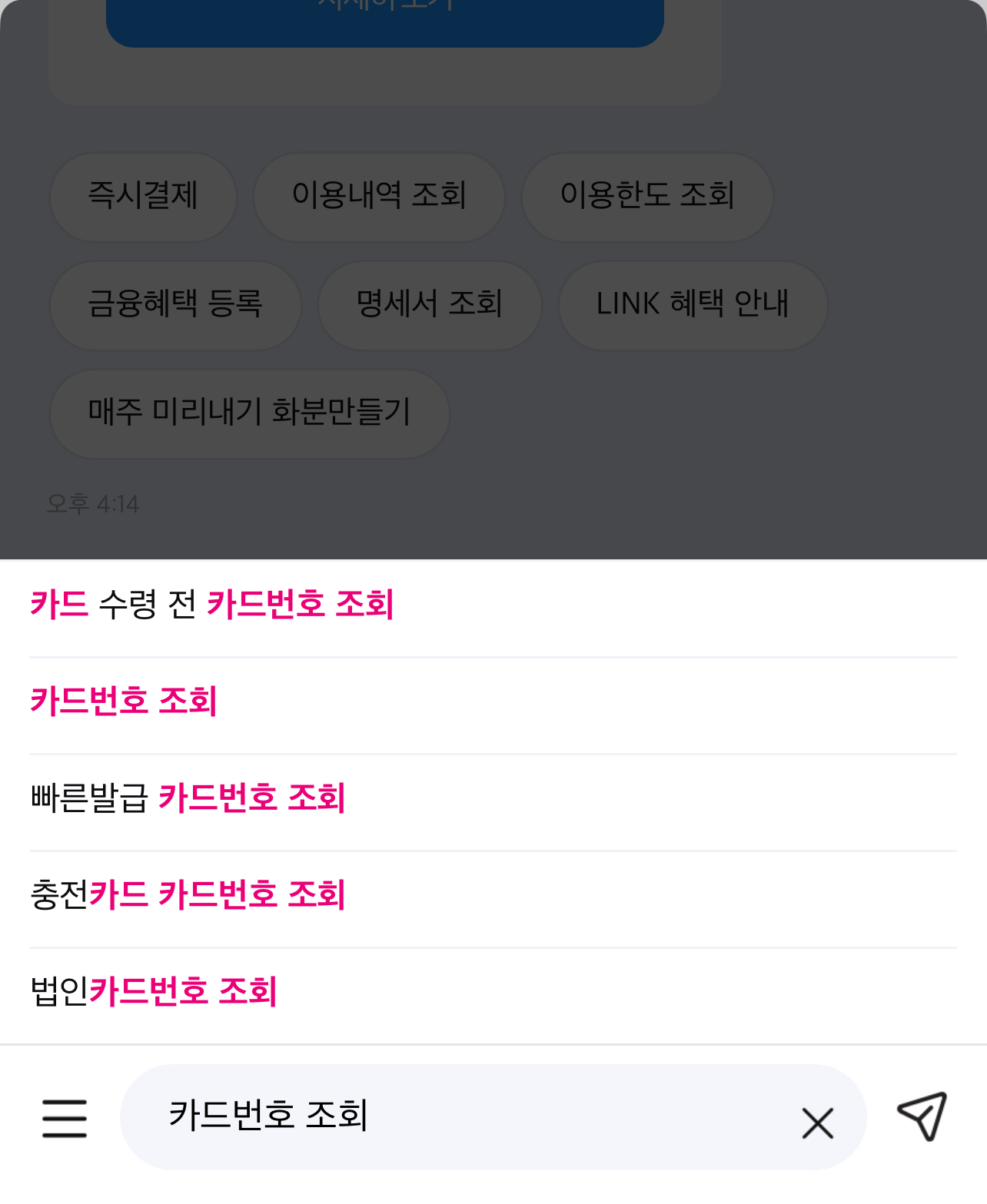 챗봄 샘 검색창에 ‘카드번호 조회’를 검색하시면 위 사진처럼 카드 수령 전 카드번호 조회, 카드번호 조회, 빠른발급 카드번호 조회, 충전카드 카드번호 조회, 법인카드번호 조회 등 다양한 서비스도 간편하게 이용이 가능합니다.