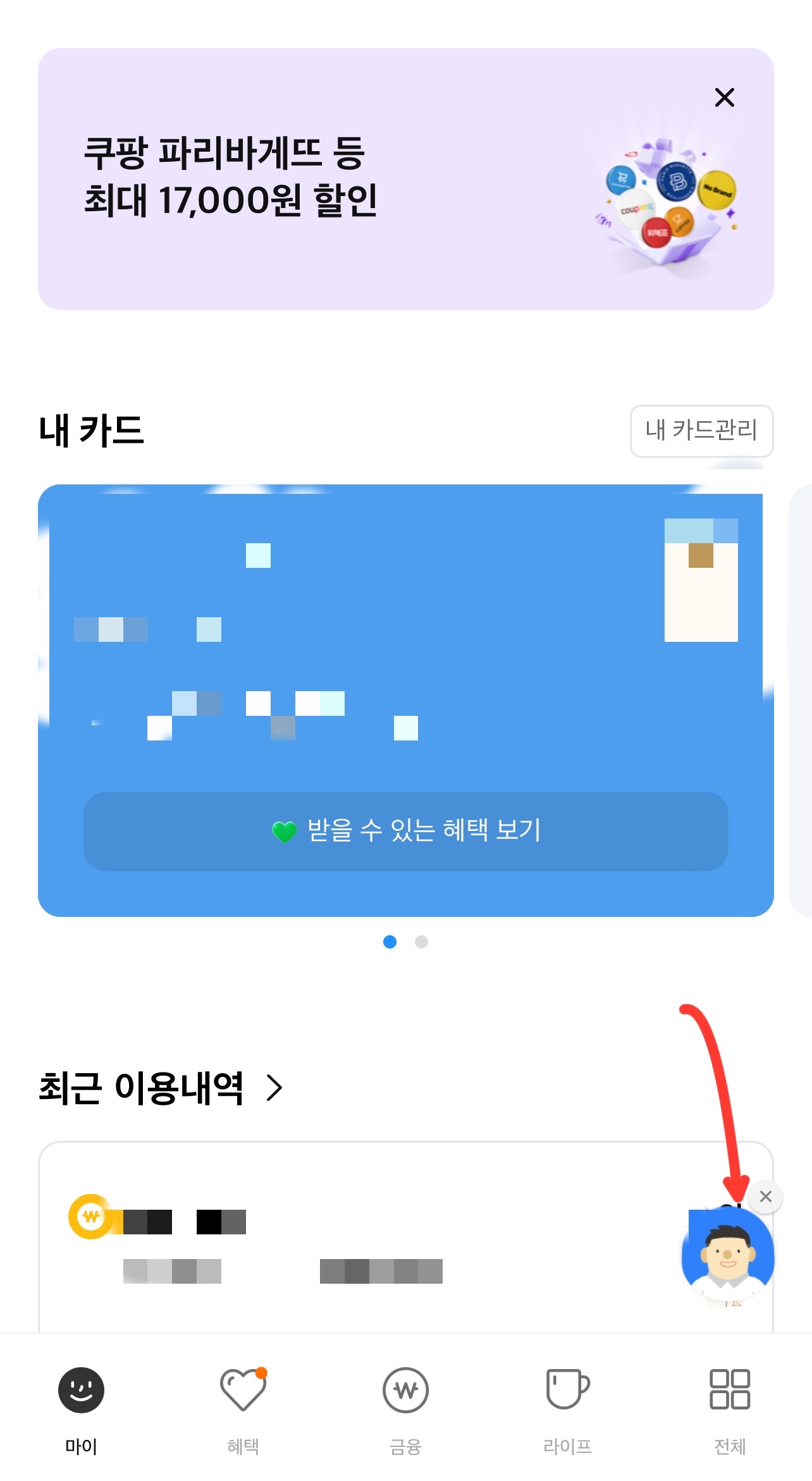 2. 하단에 전체 탭 클릭 후 카드이용 메뉴에서 내 카드 관리 클릭