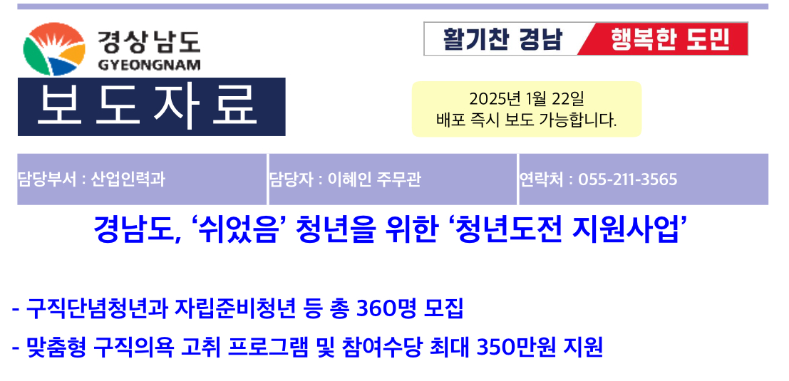 경상남도(도지사 박완수)는 구직단념청년*의 구직의욕을 고취해 취업시장으로 이끄는 ‘청년도전 지원사업’을 다음 달부터 실시한다고 밝혔습니다.