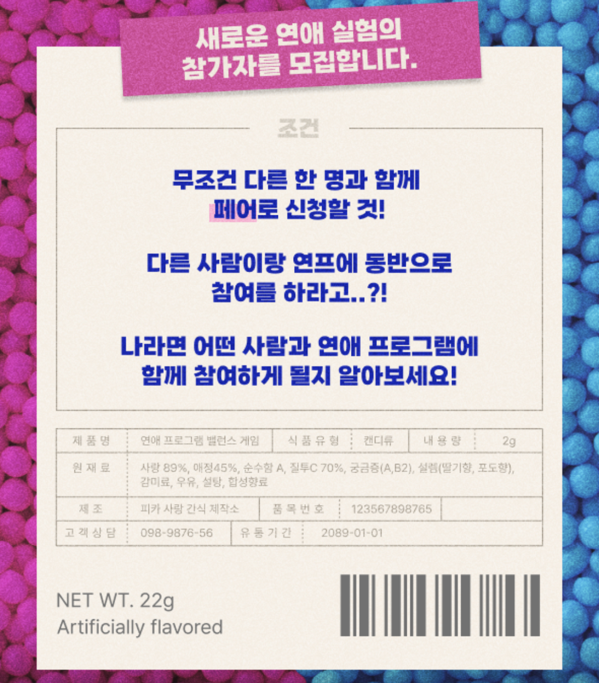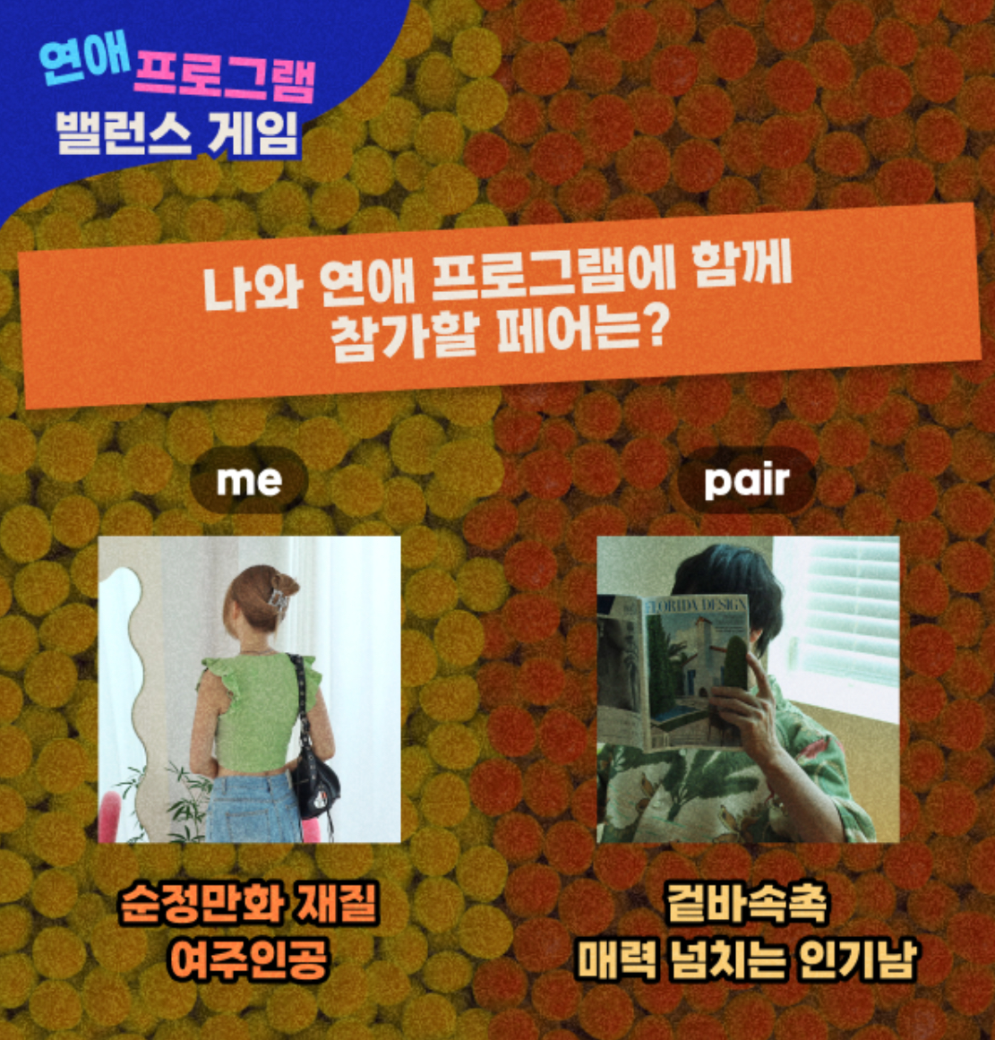 만약에 내가 연애 프로그램에 출연한다면 나는 누구랑 함께 참여하게 될지 알아볼 수 있는 ‘연애 프로그램 밸런스 게임 테스트’를 소개드리겠습니다.