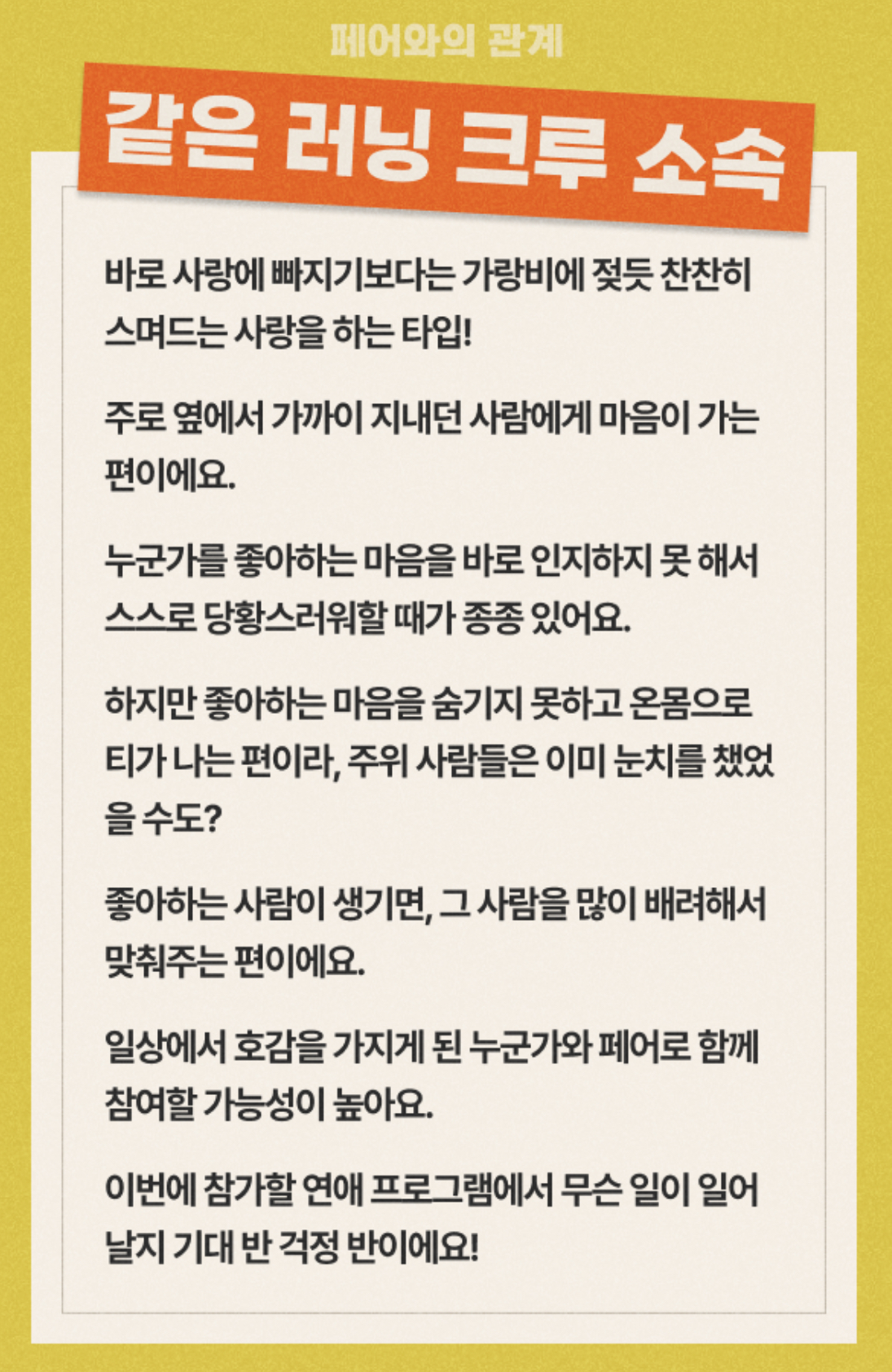 일상에서 호감을 가지게 된 누군가와 페어로 함께 참여할 가능성이 높아요.