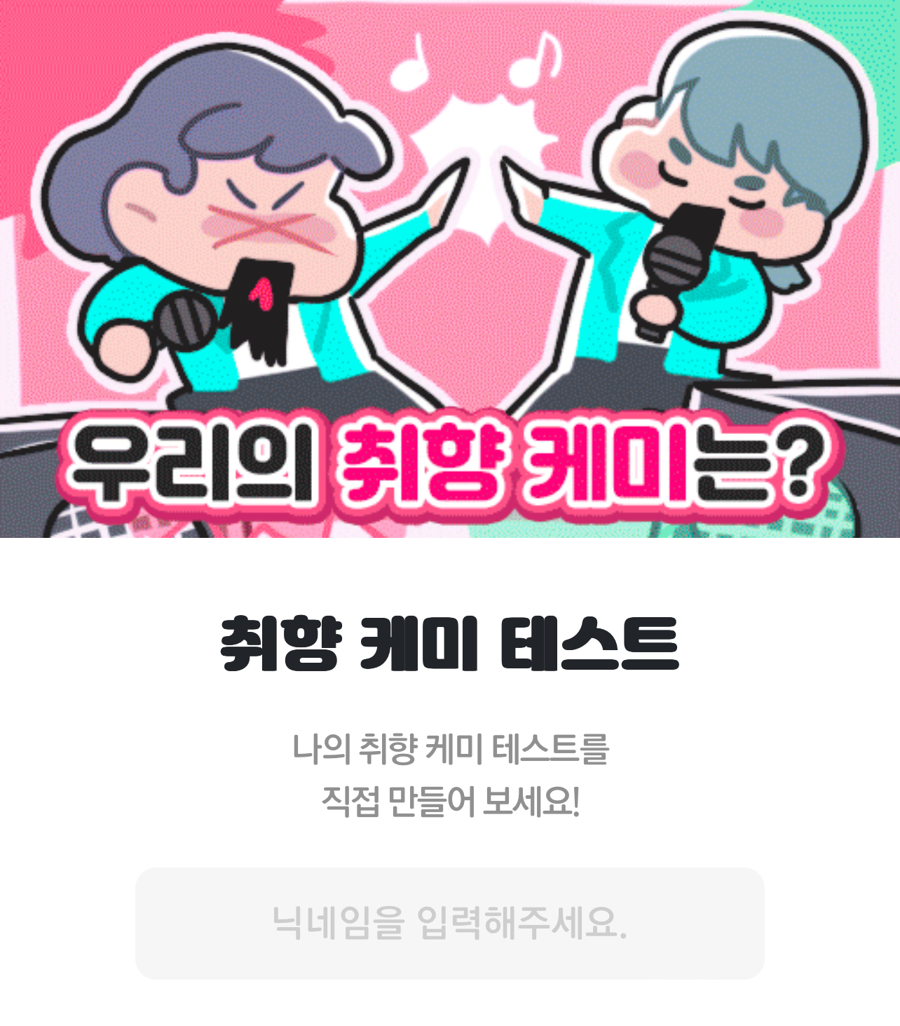 취향 케미 테스트는 먼저 본인의 닉네임을 입력해서 테스트 만들 준비를 하시면 됩니다.