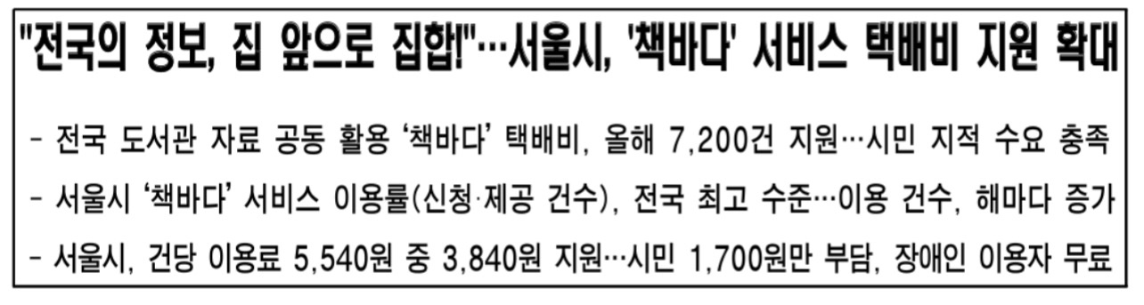 서울시의 책바다 서비스 이용 도서 수는 전국 최고 수준인데 지난해 기준으로 전국 17개 시도의 신청 건수 중 30%, 제공 건수의 28%를 서울시가 차지했다고 합니다.