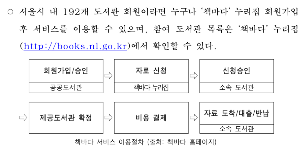 서울시 내 192개 도서관 회원이라면 누구나 ‘책바다’ 누리집(https://books.nl.go.kr)회원가입 후 서비스를 이용할 수 있으며 이용 금액 5,540원 가운데 서울시가 지원하는 3,840원을 제외한 1,700원만 부담하면 되고 장애인은 무료로 이용이 가능합니다.