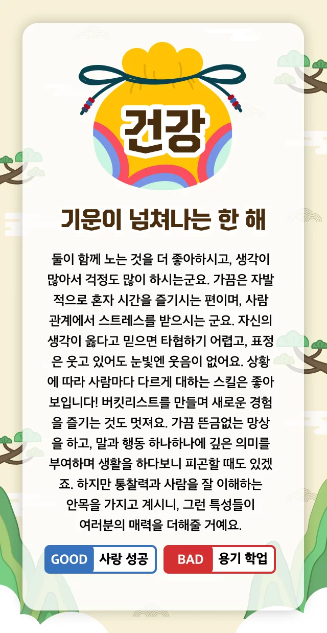 기운이 넘쳐나는 한 해 둘이 함께 노는 것을 더 좋아하시고, 생각이 많아서 걱정도 많이 하시는군요.