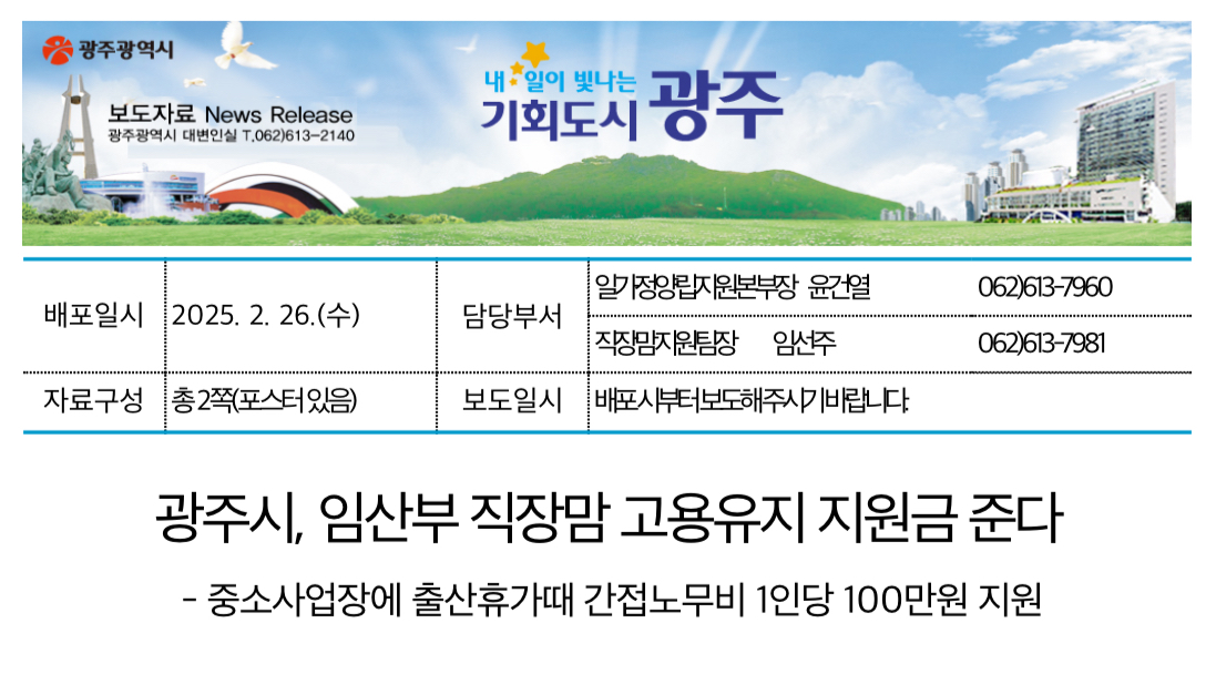광주광역시 일가정양립지원본부는 지역 중소사업장의 근로자가 출산 전후 휴가 등에 따라 발생하는 사업주의 부담금을 지원하는 ‘임산부 직장맘 고용유지 지원사업’을 추진한다고 말했습니다.