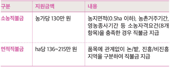 - 면적직불금 : 농지면적(0.5ha 이하), 농촌거주기간, 영농종사기간 등 소농자격요건(8개 항목)을 충족한 경우 직불금 지급
