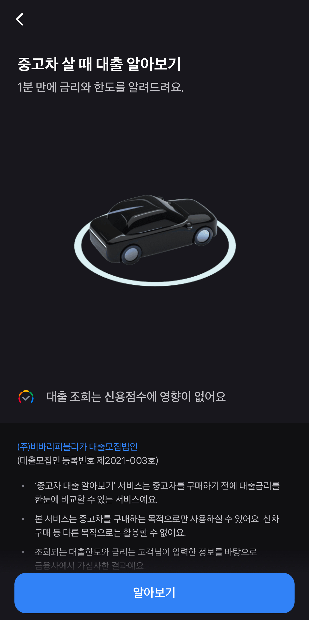 • ‘중고차 대출 알아보기’ 서비스는 중고차를 구매하기 전에 대출금리를 한눈에 비교할 수 있는 서비스예요.