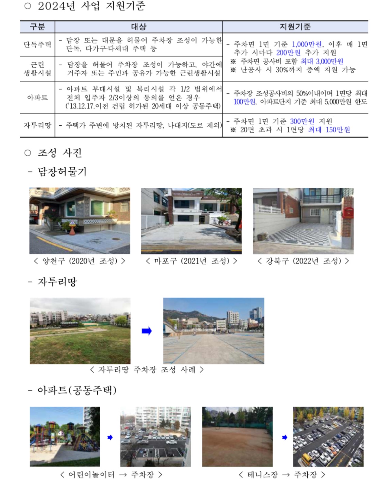 2024년 올해부터는 주차장을 조성하고자 하는 시민들을 위해 지원금을 1면당 1000만원으로 향상하는 등 지원폭을 확대했다고 합니다.
