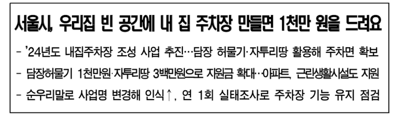 서울시는 2024년 올해 내 집주차장 조성 사업을 추진하고, 참여 시민을 모집한다고 밝혔습니다.