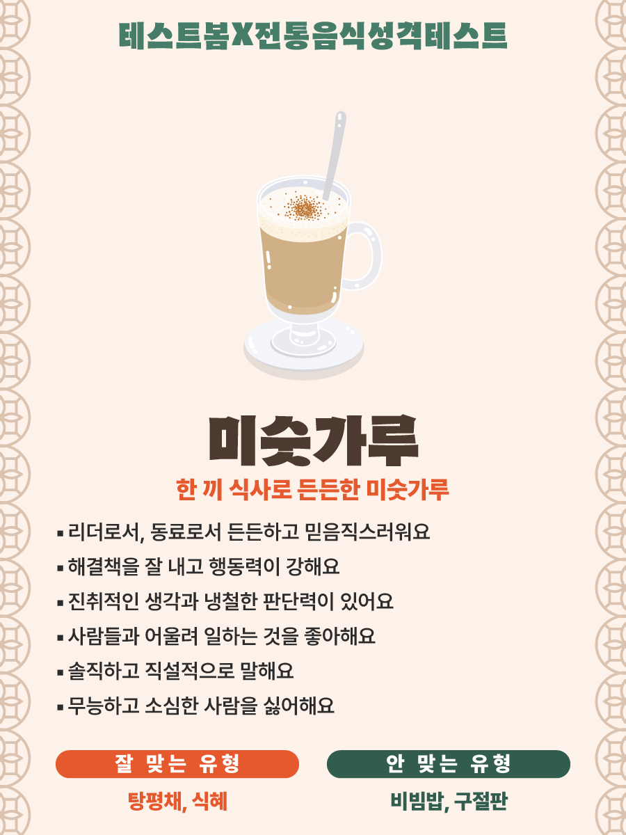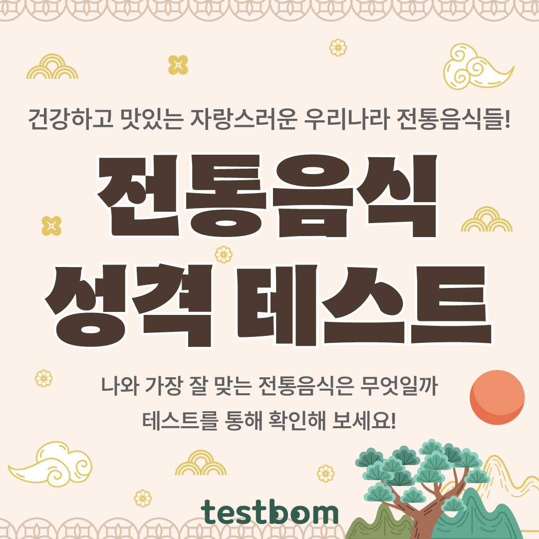 나와 가장 잘 맞는 전통음식은 무엇일지 알아보는 테스트봄에서 나온 ‘전통음식 성격 테스트’를 소개드리겠습니다.