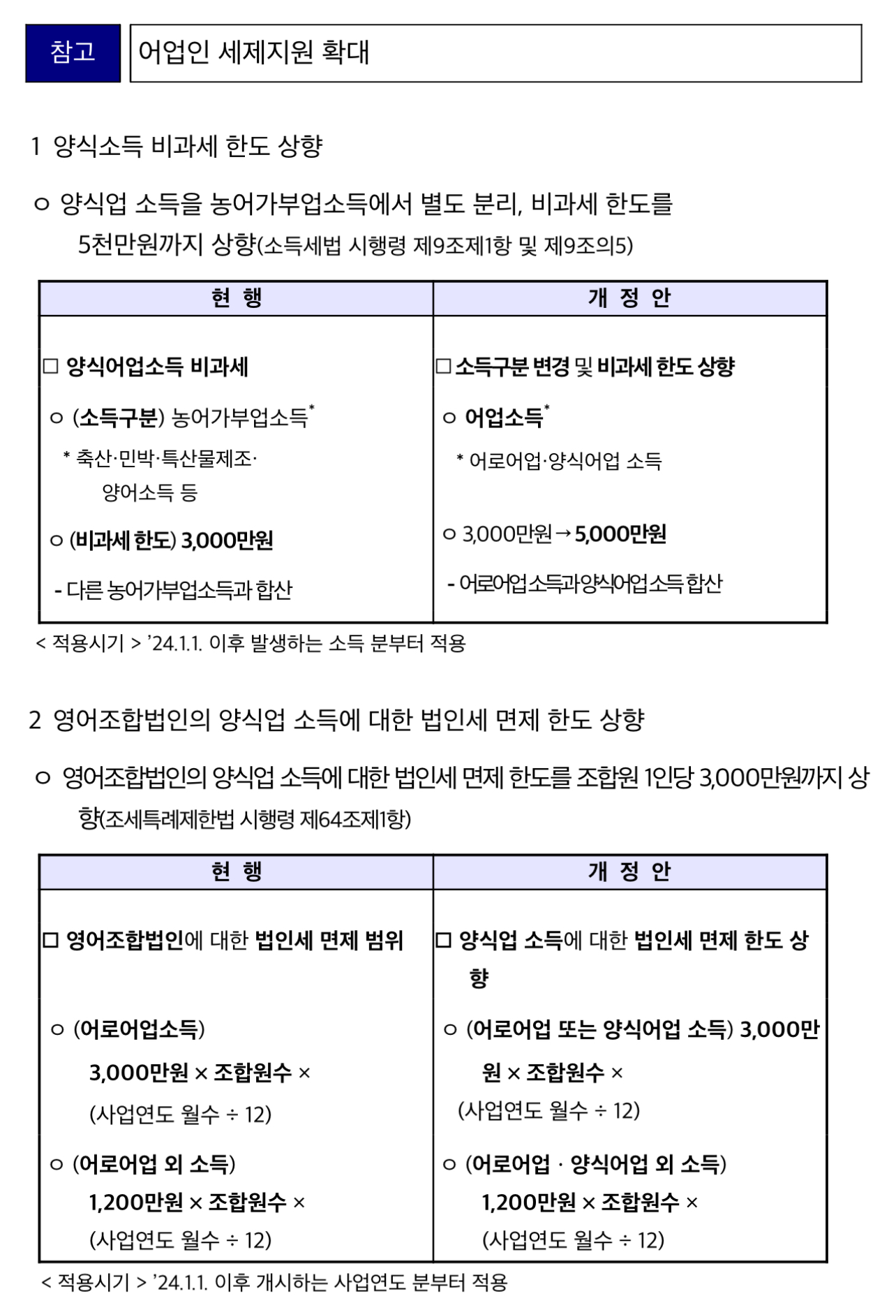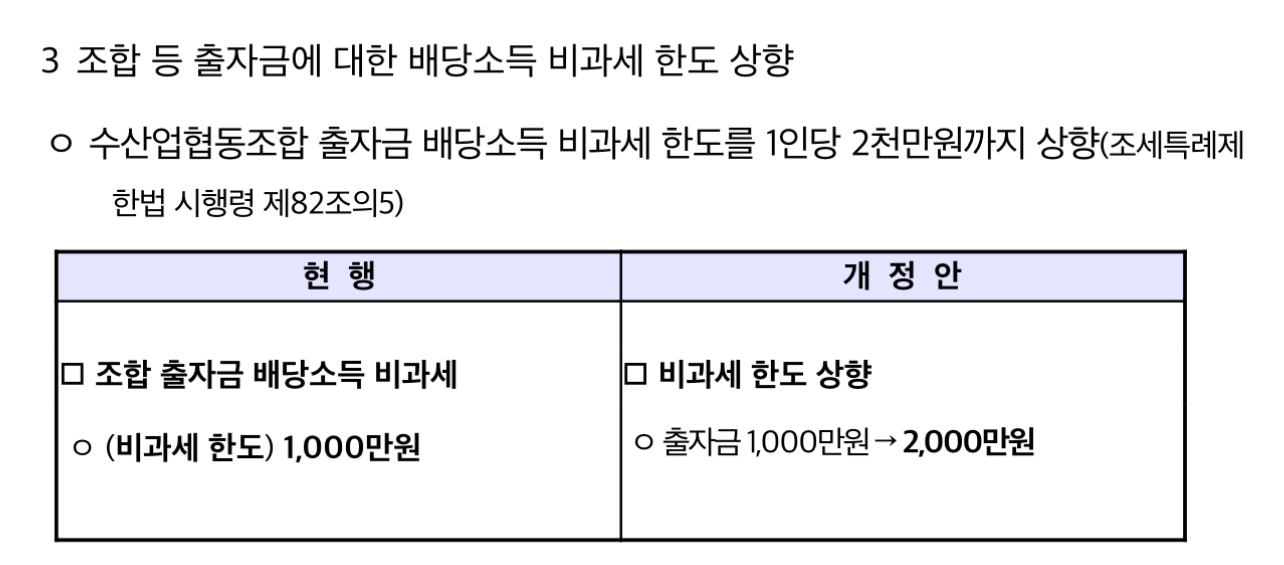 또한 「조세특례제한법 시행령」 개정을 통해 영어조합법인의 양식업 소득에 대한 법인세 면제 한도와 조합 출자금에 대한 배당소득 비과세 한도도 확대되었다고 합니다.