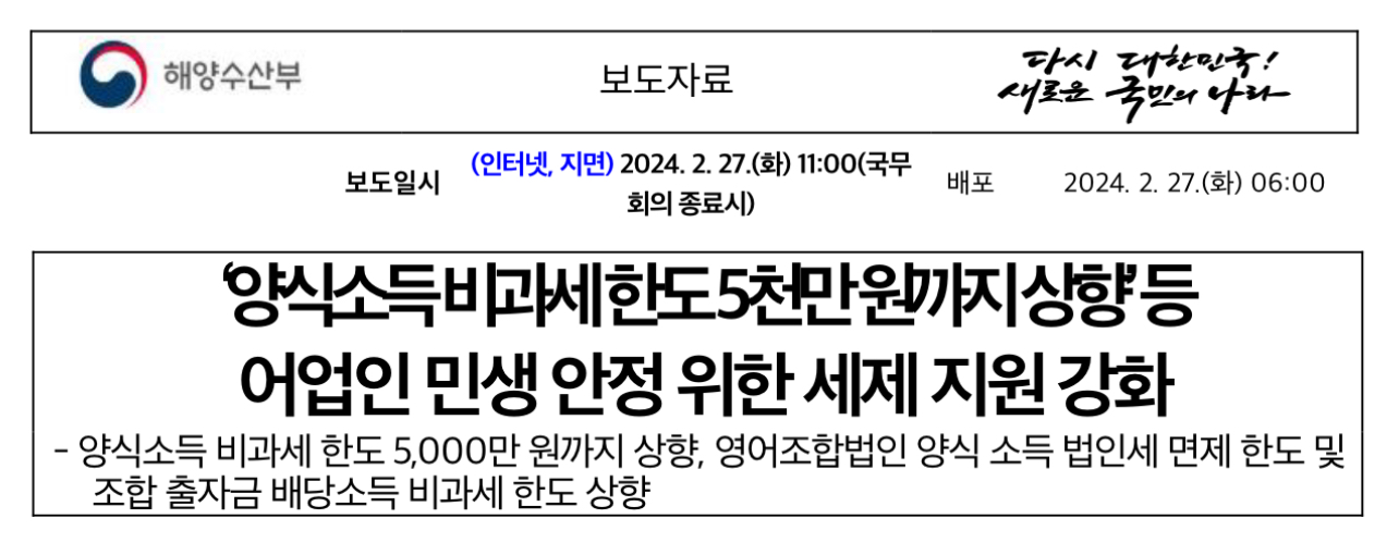 2024년부터는 양식업을 전업으로 하는 어업인도 소득의 5천만 원까지 소득세를 감면받을 수 있게 된다고 합니다.