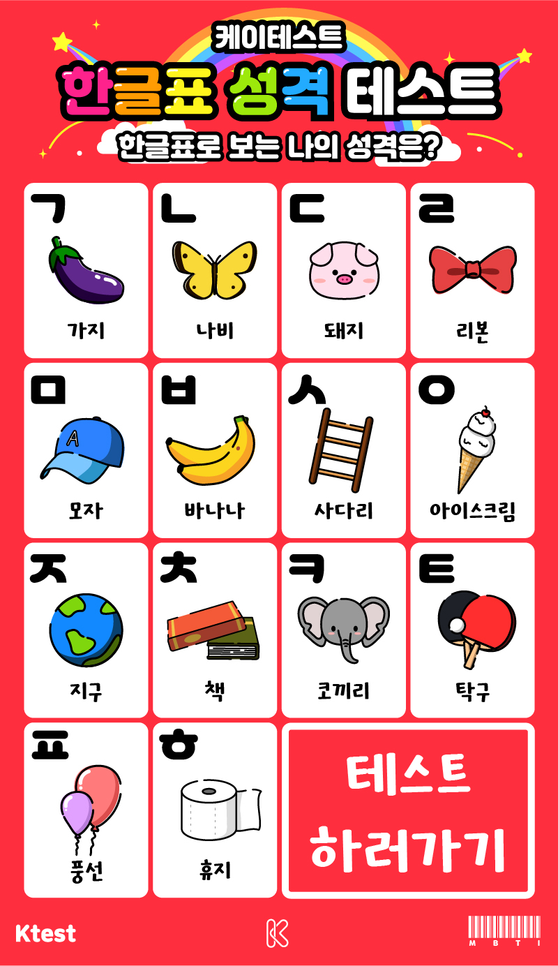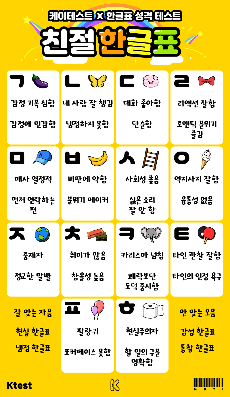 한글표로 보는 나의 성격은 어떨지 알아보는 ‘한글 표 성격 테스트’가 케이테스트라는 사이트에서 새로 나왔는데 소개와 더불어 모든 유형 mbti까지 알려드리겠습니다.