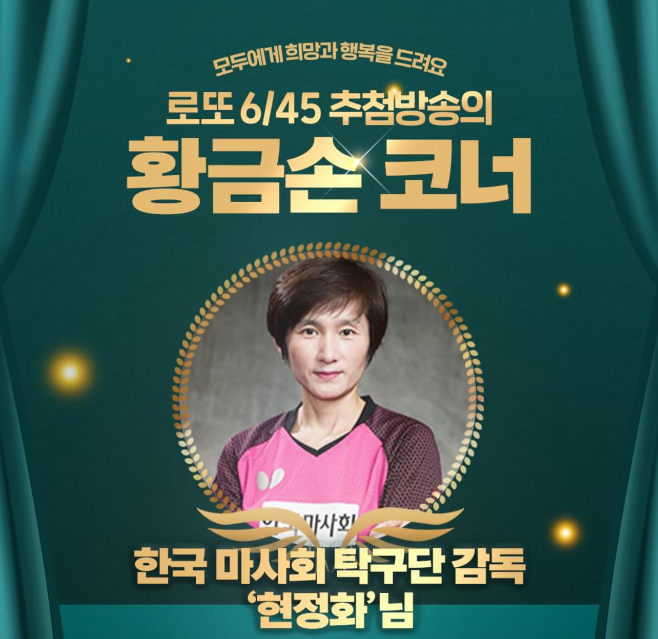 탁구감독 현정화가 1109회 '생방송 행복드림 로또 6/45'의 '황금손'으로 출연한다고 합니다.