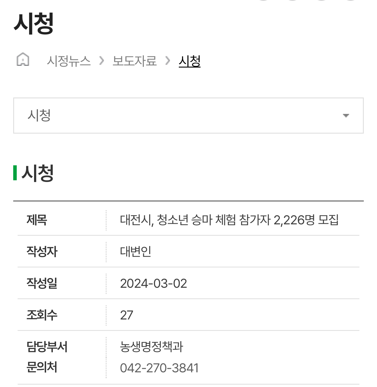 대전시는 청소년의 체력 증진과 건전한 여가문화 선도 및 국내 승마 인구 확대를 위해 초·중·고 학교 학생들을 대상으로 ‘2024년도 학생승마 지원사업’ 참가자를 모집한다고 밝혔습니다.