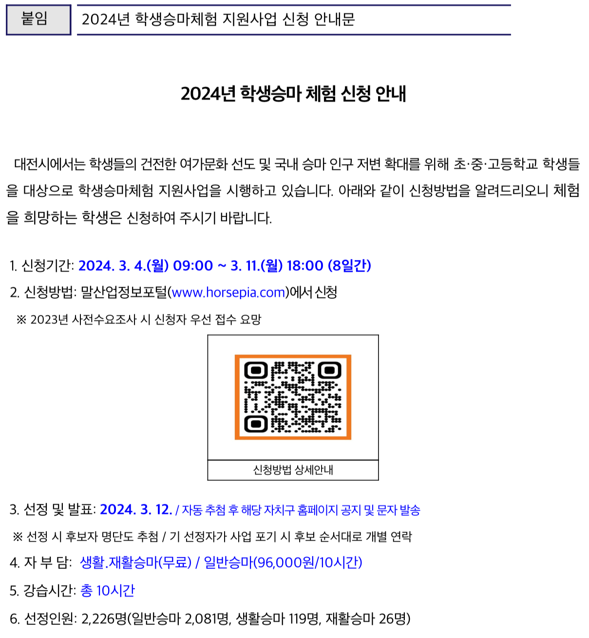 대전 청소년 승마 체험 지원 신청 접수는 2024년 3월 4일(월) 9시부터 3월 11일(월) 18시까지이며 말산업정보포털(www.horsepia.com)에 가입 후 신청하면 됩니다.