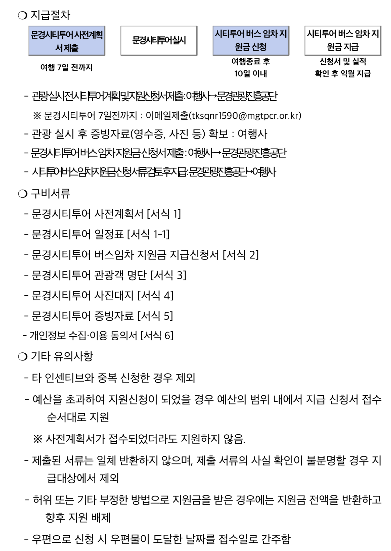해당 여행사는 문경관광진흥공단에 여행 7일 전 사전 신청하고, 시티투어 종료 후 관련 증빙서류를 제출하면 투어버스 임차료를 지원받을 수 있습니다.