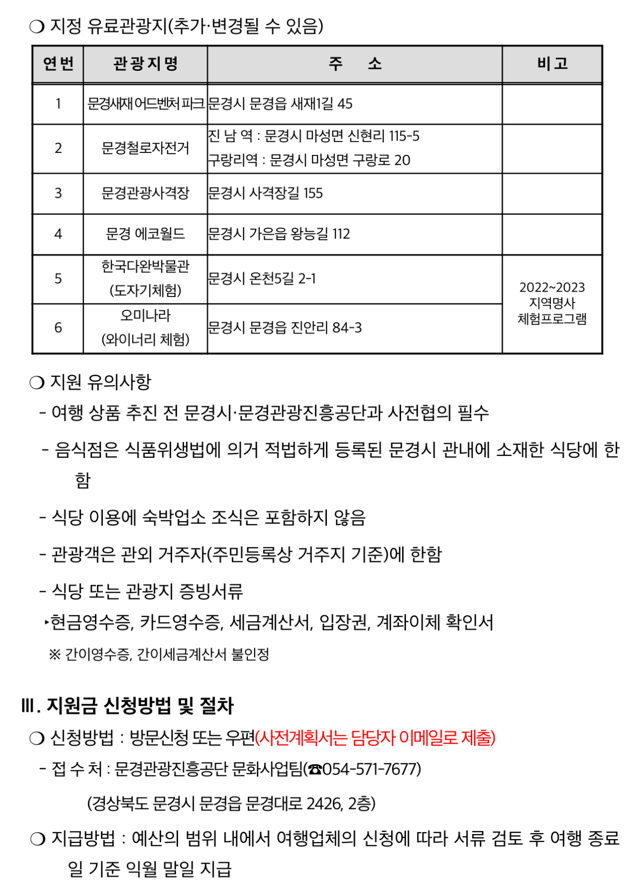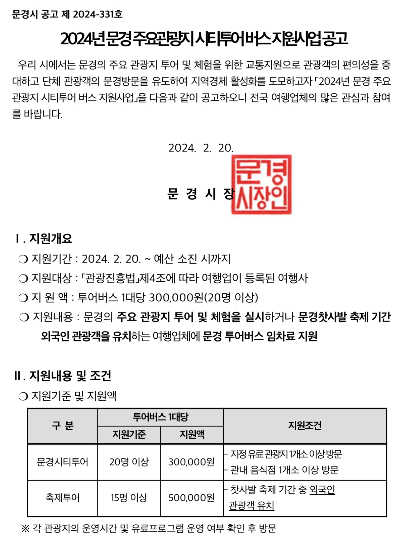 문경시에 따르면 관광진흥법에 따라 등록된 여행사가 지역 외 거주 관광객을 20명 이상 모집해 문경시에서 지정한 유료 관광지 1개소 이상, 지역 내 음식점 1개소 이상 방문 등 지원 요건을 충족할 경우 투어버스 1대당 30만 원을 지원한다고 합니다.