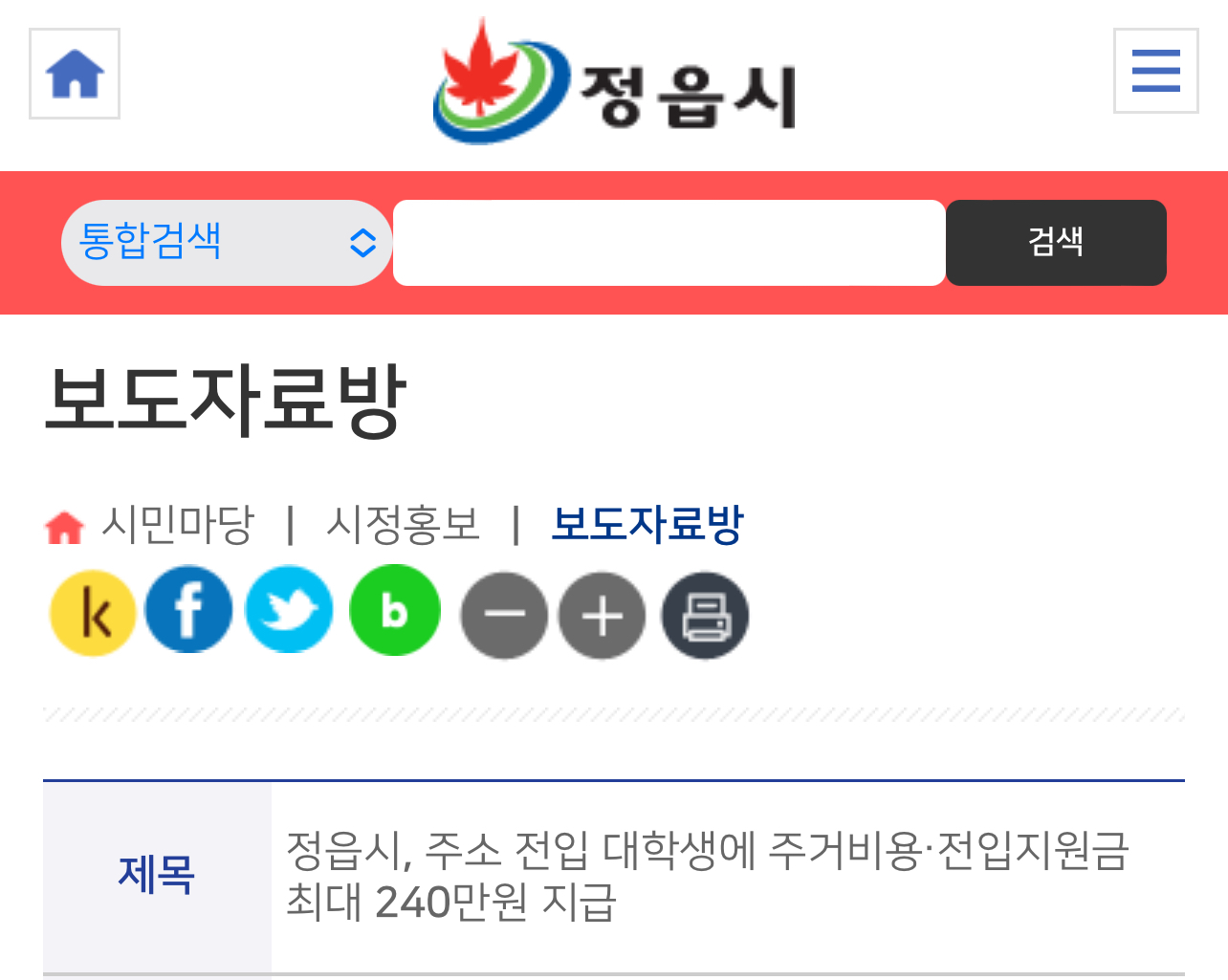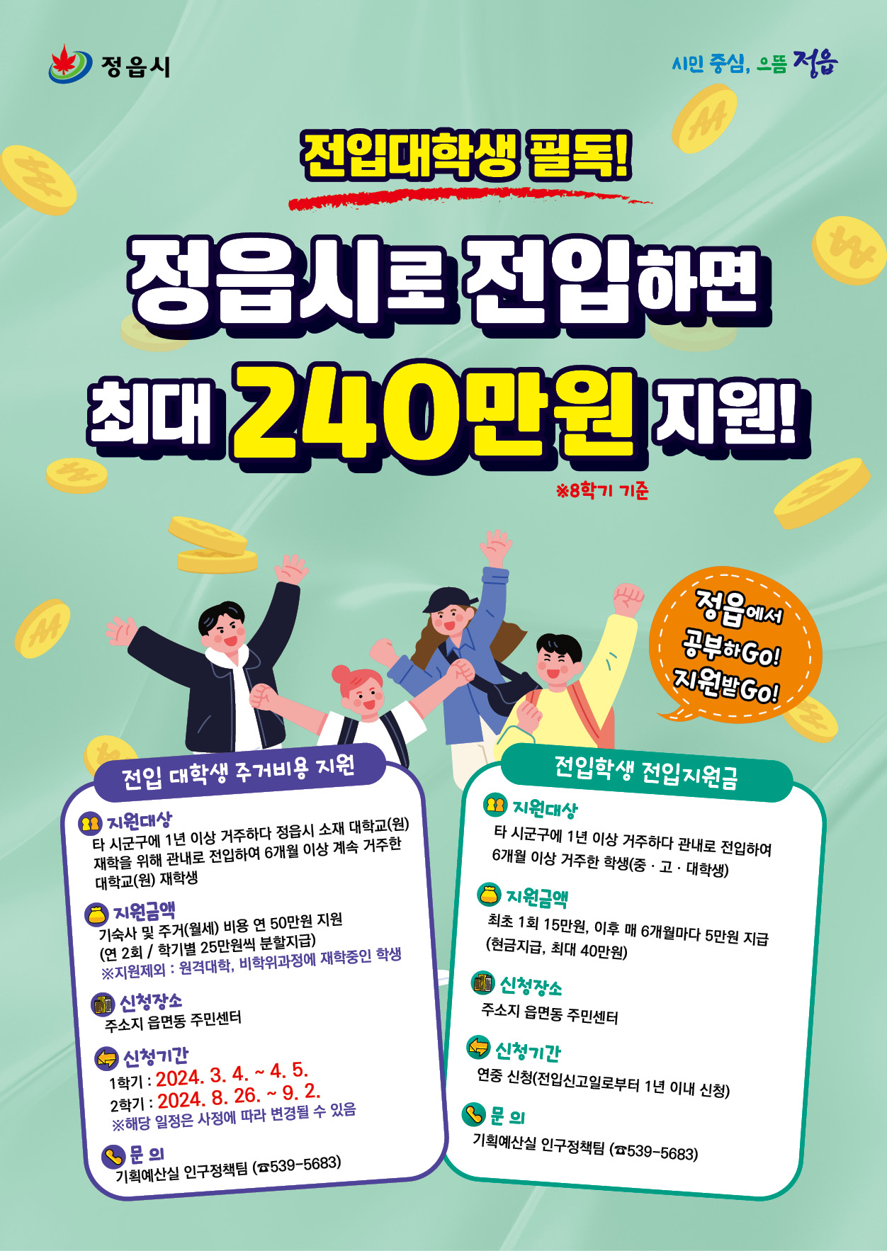 2024년 올해 처음 추진하는 전입 대학생 주거비용 지원금은 타 지역에 1년 이상 주소를 두고 있다가 정읍시로 전입한 후 6개월 이상 경과한 관내 대학교(원) 재학생 지급한다규 합니다.