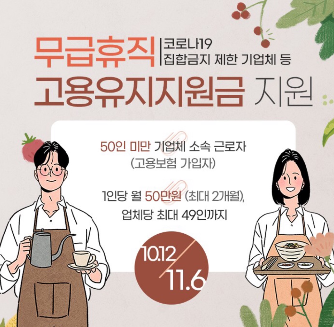 월 5일 이상 무급휴직하고 지원금 지급예정일(11.23.)까지 고용보험을 유지하는