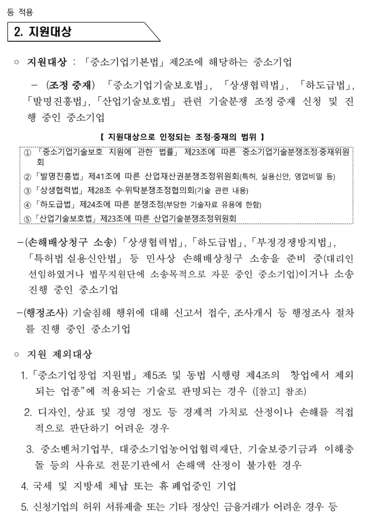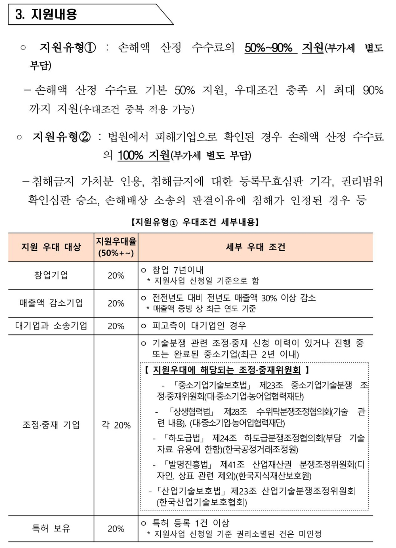 다만 2024년 올해부터는 소송을 준비 중인 기업(변호사 선임 또는 중소벤처기업부 법무지원단에 소송목적으로 자문 중인 기업)과 행정조사 절차를 진행 중인 기업까지 확대했으며 아울러 기술침해 피해기업의 소송을 대리하는 변호사도 직접 지원을 신청할 수 있도록 했다고 합니다.