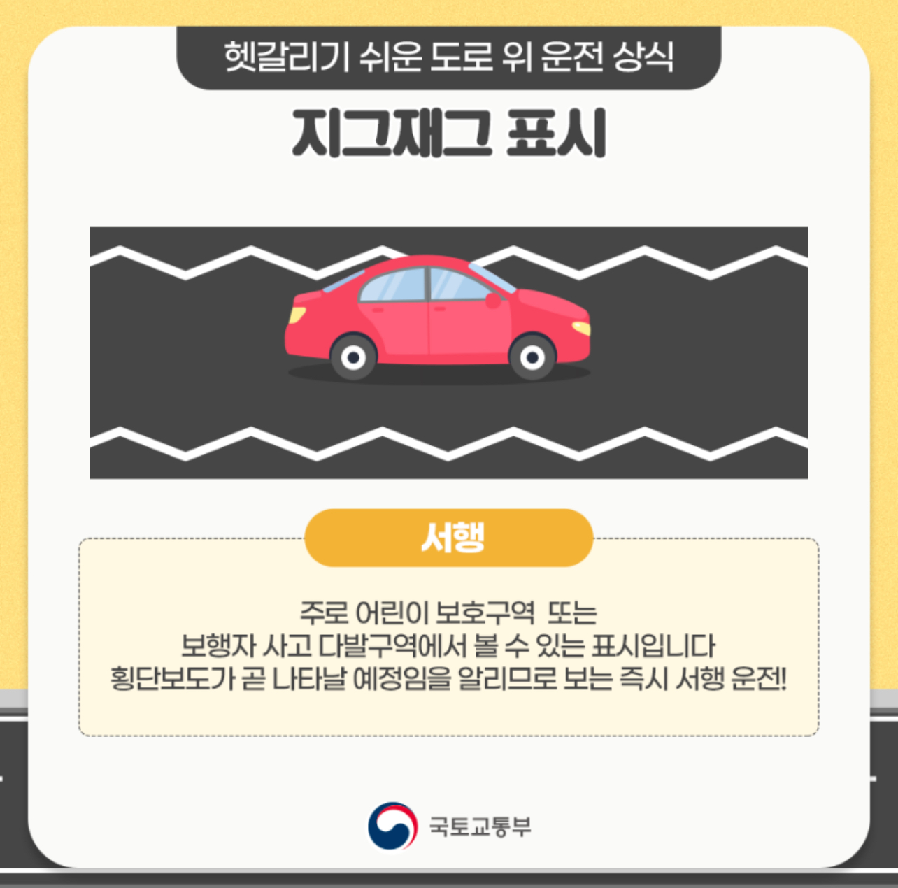 운전자들이 운전 중 도로 위 화살표와 같은 각종 노면표시가 있는데 도로 마름모 지그재그 역삼각형 빗금 등 노면표시를 헷갈려하는 경우가 존재합니다.