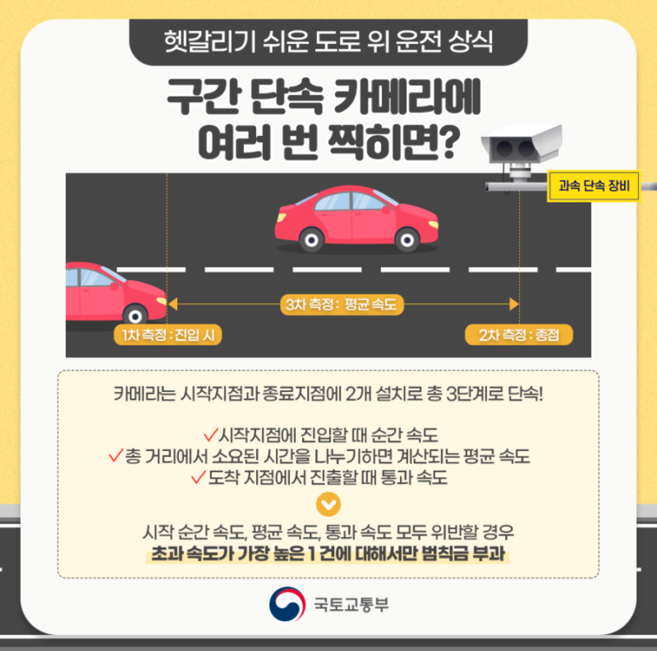 구간 단속 카메라에 여러 번 찍히면 카메라는 시작지점과 종료지점에 2개 설치로 총 3단계로 단속됩니다.
