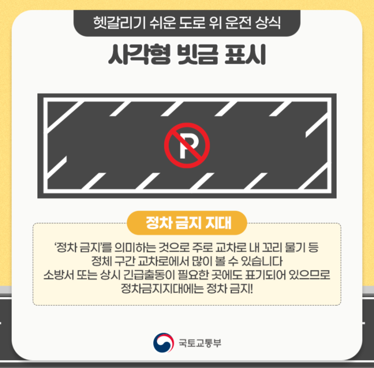 사각형 빗금 표시는 정차 금지 지대를 의미합니다.